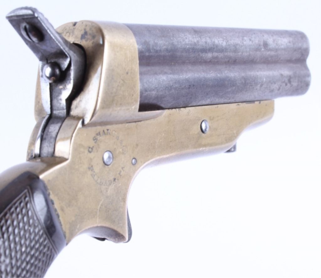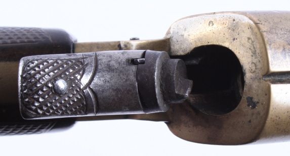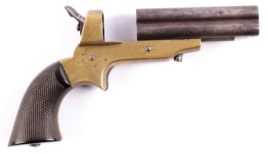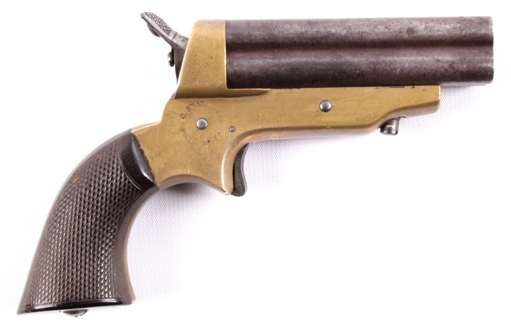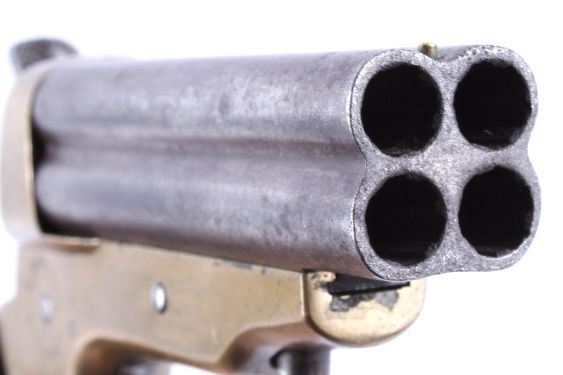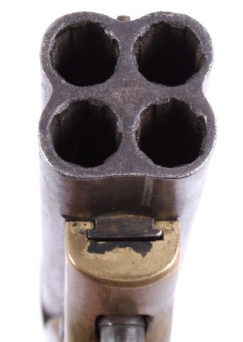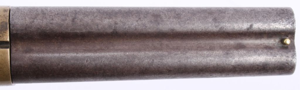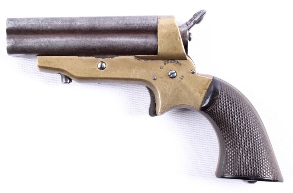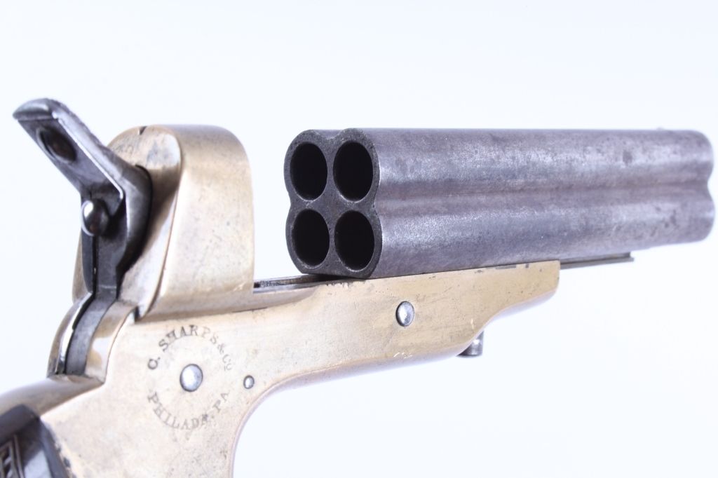 This is an early Sharps first model 2A pepperbox single action pistol in a .30 caliber. This shows great condition and does work having a serial number 6228.The piece is marked on both sides of the action, "C.Sharps Patent 1859." Shows wonderful brass, with wood handles, and bluing across the barrel.