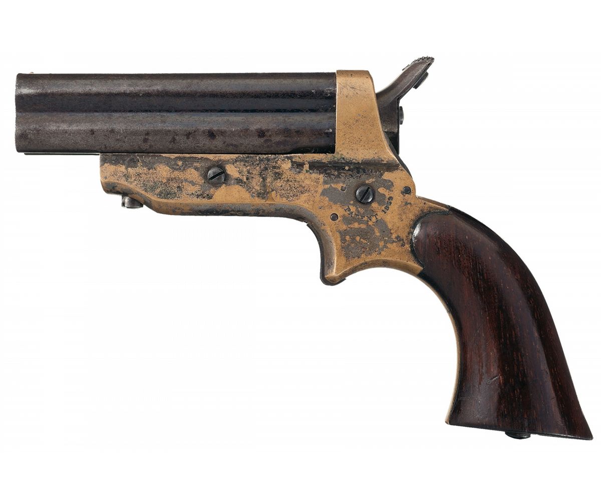 This pistol features a straight standing breech, rounded grip to frame juncture, barrel release on the underside of the frame and walnut grips. The frame has the 1859 patent date stamped on the left side around the screw and the Sharps Philadelphia address marking is on the right side. The barrel cluster is numbered to the gun.