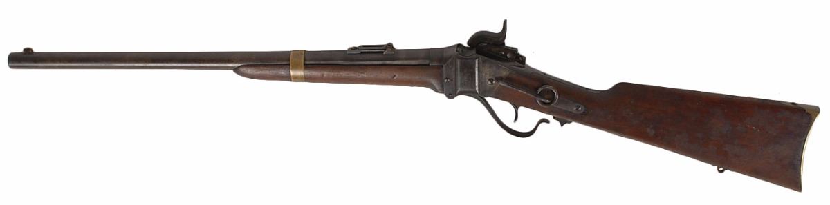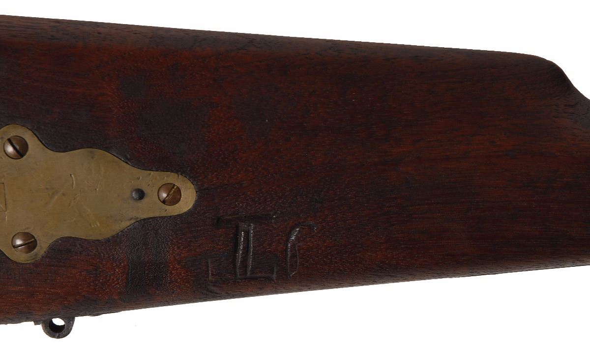 Rare Sharps New Model 1859 Carbine with brass furniture, serial number 33009, .54 caliber, 22? barrel with a very good bore that has dark freckling within the grooves. This is a 2nd variant New Model carbine with matching numbers that has the early brass furniture and friction ridges on the back of the breechblock. The barrel and frame have developed a dark plum-brown patina over time with mild pinprick pitting at the muzzle and along the other exposed metal. The lockplate was cleaned to a somewhat grayer patina in the past with crisp markings and visible work marks. The rear sight is missing both the long range slider and the right side hinge piece, but is still held firmly in place. The walnut forend and buttstock have an added military oil finish over numerous handling marks and blemishes scattered throughout the wood. There are initials crudely carved into the right side of the buttstock just ahead of the patchbox: “JT,” and there are no indications of US inspector stamps on the left side of the wrist. The brass patchbox, buttplate, and barrel band have developed a mellow, dark ochre patina over time and there is a short, with-the-grain crack running forward from the patchbox hinge plate, a repaired chip at the toe, and a repaired with-the-grain crack along the bottom of the forend running through the screw bolster. The action is tight and fully functional, and this is a great looking pre-Civil War Sharps with early features that would make a great addition to any collection. Ref. Sharps Firearms by Frank Sellers; 1978.