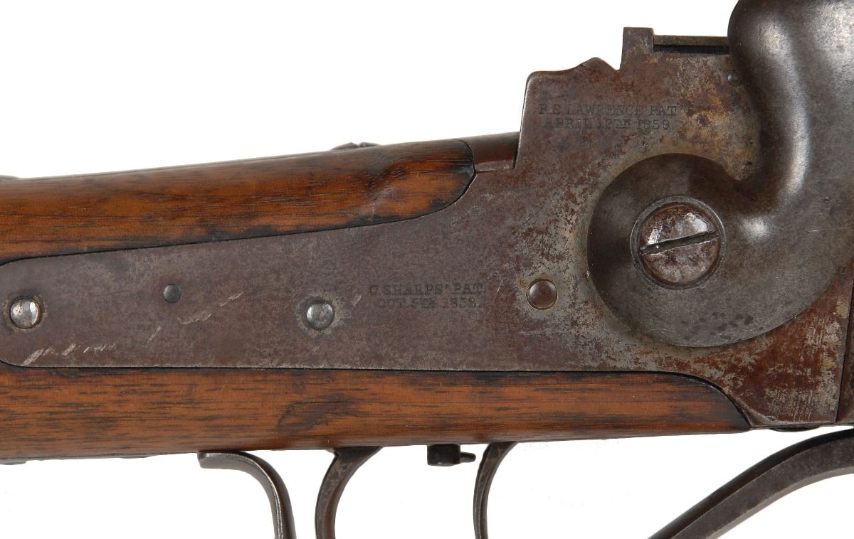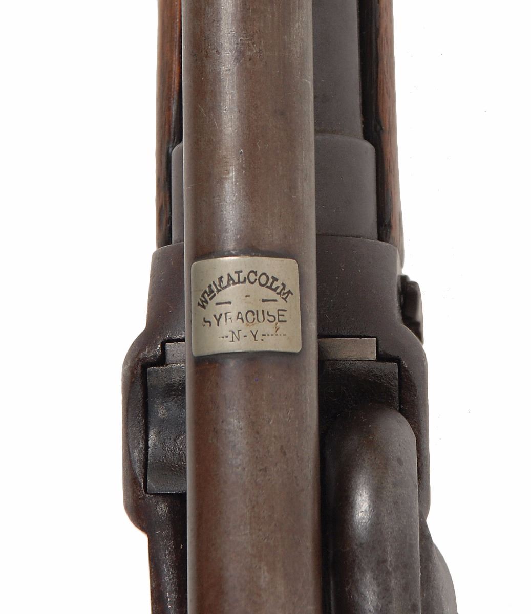 Civil War Sharps New Model 1859 Military Rifle with Malcolm Scope in the Berdan serial number range, serial #55159, .52 caliber, 29? barrel with a fine, bright bore having some very mild freckling within the grooves towards the breech. This double set trigger equipped rifle has an overall smooth, plum-brown patina with gray speckling evenly distributed around the receiver. The barrel is original, numbered to the gun under the forend, and was trimmed by 1? at the muzzle which removed the bayonet lug and front sight. Indeed, this may have been the reason for the modification. The action itself is tight and the trigger mechanism is fully functional with a crisp, light let off when set. The rifle is equipped with a Malcolm telescopic sight that measures 33 1/8? in length with a tube diameter of 3/4?. The optics are slightly cloudy, but still perfectly serviceable, and the fine crosshair reticle, with four horizontal stadia for different ranges, is intact and in excellent condition. The top of the scope tube has a small maker's plaque mounted towards the ocular eyepiece: “Wm. Malcolm, Syracuse, N.Y.” The walnut forend is held by three barrel bands and is in very good condition with numerous small handling marks and small blemishes along its length, as well as heavy wear to the wood surrounding the screw bolster on the underside. The wood was very lightly sanded at some point with a lightly hued oil finish added. The patchbox equipped buttstock has a matching oil finish with some further surface marks and minor bruises, although the US military inspector’s cartouche is still visible on the left side of the wrist. The rifle sits squarely within the accepted range for rifles issued to Hiram Berdan's legendary US Sharpshooters (54374 to 57567), but is also only one number away from an identical double set trigger 1859 Sharps issued to the famous ‘Bucktails,’ Co. F, 42nd Pennsylvania Infantry, who were partially armed with rifles originally intended for the 1st and 2nd US Sharpshooters. Double trigger Sharps rifles are among the most desirable Civil War weapons and finding one with functional period optics is truly rare. This example is in very good condition and would make a stellar addition to any collection. Oversized.