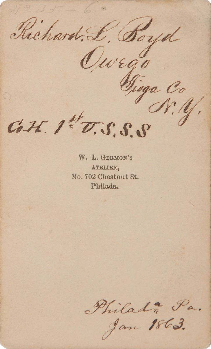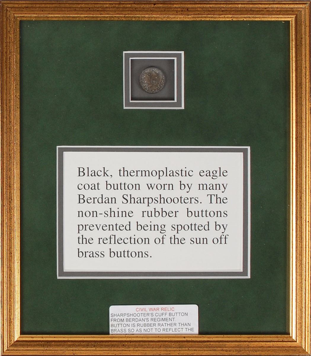 Additionally includes several related accompaniments, including: a framed black thermoplastic eagle coat button worn by many of the Berdan sharpshooters, which helped camouflage their positions rather than brass buttons which would glint in the sun; a pair of Civil War sharpshooter’s glasses with leather case; a carte-de-visite portrait of Private Richard L. Boyd of Co. H, 1st US Sharpshooters, identified on the reverse in period ink; a box of unfired Sharps ammunition; one fired bullet; and one unfired bullet.