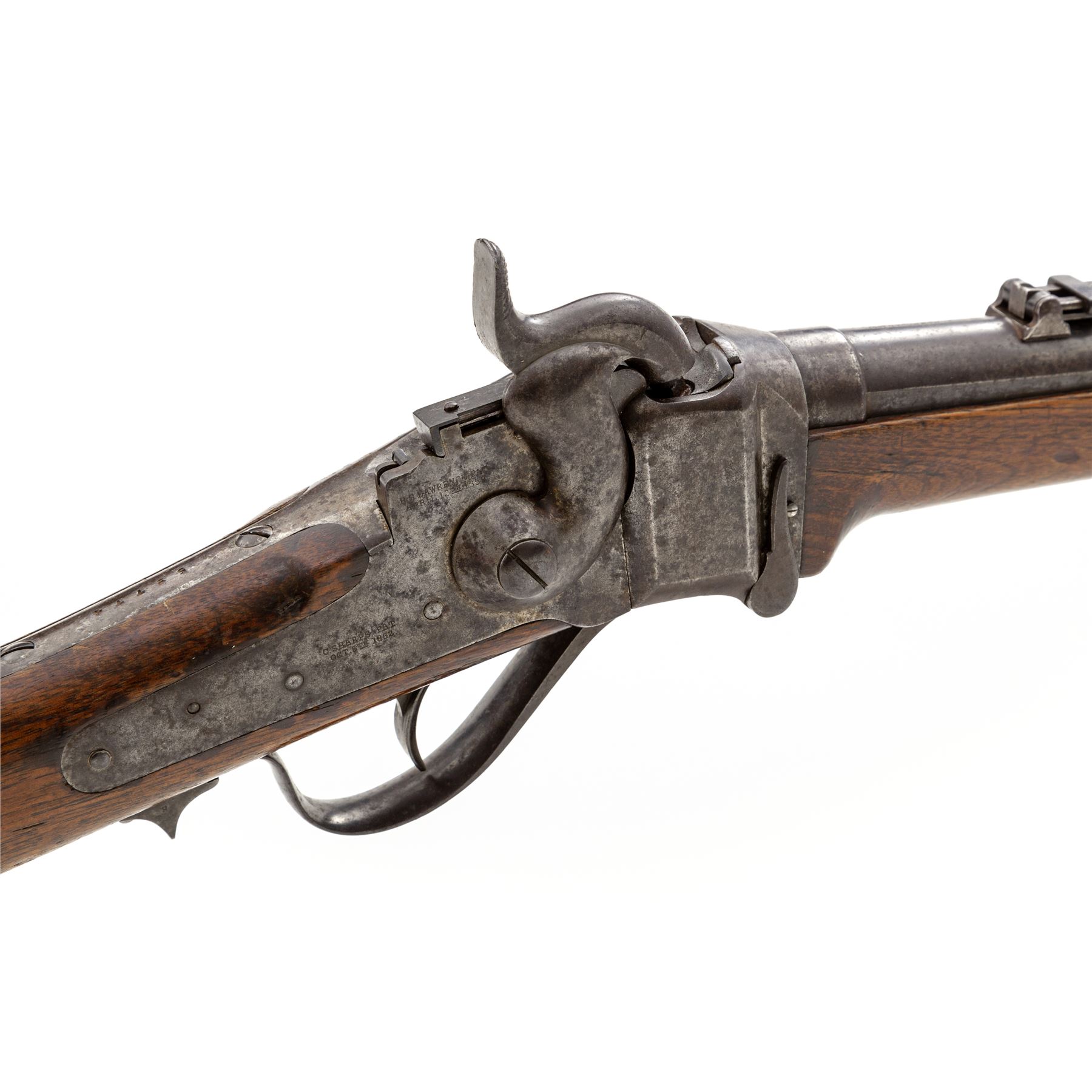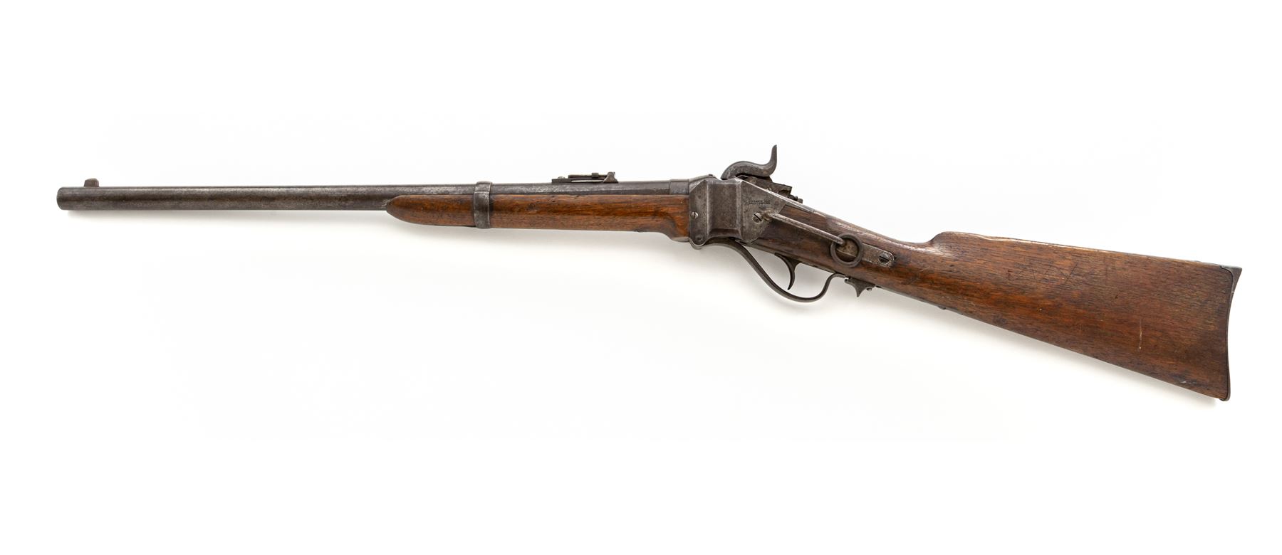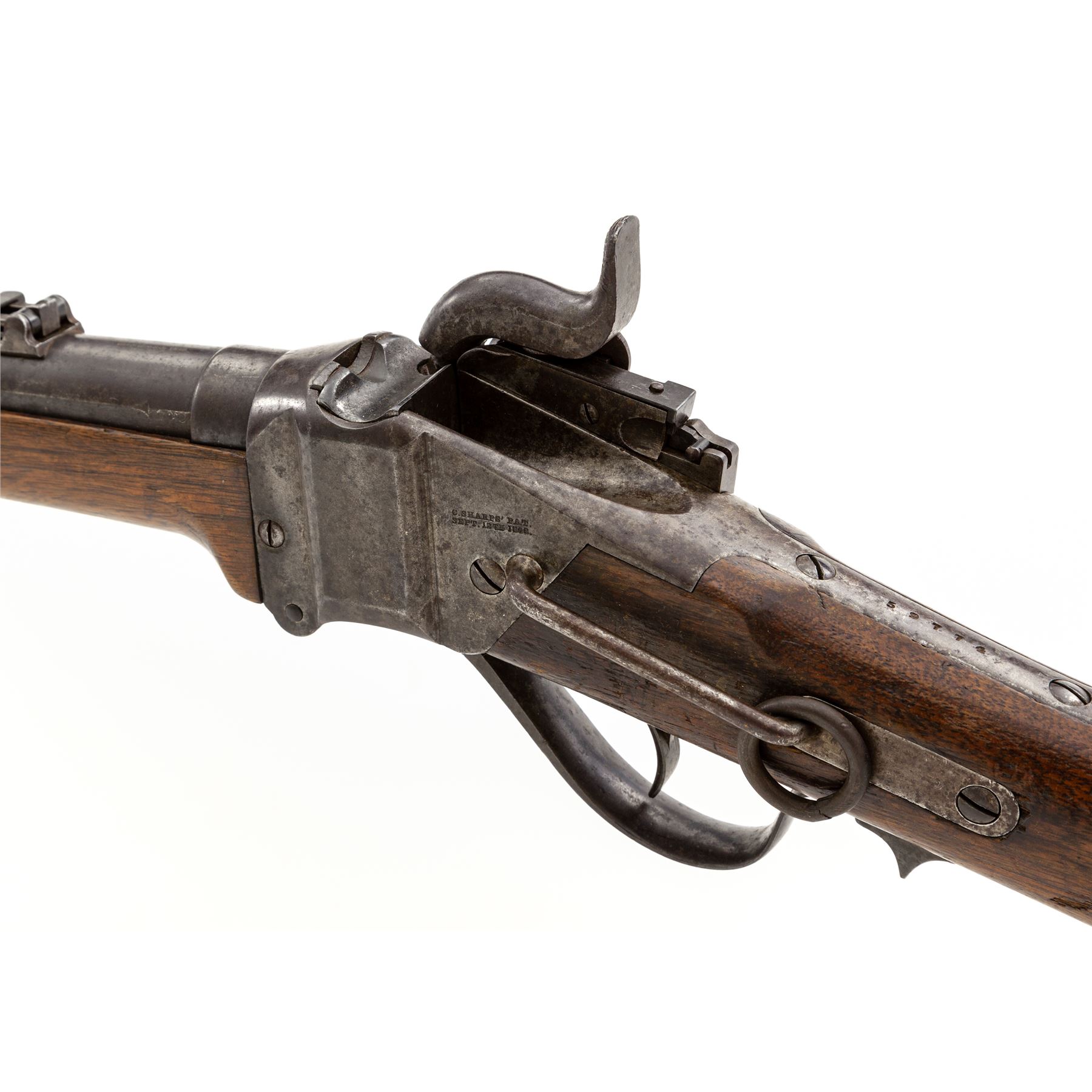 Civil War Sharps ''New Model 1859'' Percussion Saddle Ring Carbine, with Pellet Priming System, #59774, .52 cal., 22'' round barrel, with integral block-blade front and Lawrence patent sliding-leaf rear sights marked ''Sharps Rifle/Manufg. Co./Hartford, Conn.'' behind single spring-retained barrel band, and ''New Model 1859'' at breech; ''Straight Breech'' receiver is marked ''C. Sharps Pat./Sept. 12th, 1848'' and fitted with a sling bar and ring on left side, and marked ''C. Sharps' Pat./Oct. 16th, 1852'' and ''R.S. Lawrence Pat./April 12th, 1859'' on right; serpentine operating lever opens the dropping-block action for loading prepared cartridges, and cleaning; steel patchbox and carbine-style buttplate; oil-stained walnut forend and buttstock. Mfg'd ca. 1859-66. Condition is very good, the barrel with approx. 20% original blue mixing with brown patina and scattered discoloration, the other parts being mostly smooth gunmetal gray with scattered discoloration. Stocks are sound with marks from military use and age. Edges and markings are crisp; action functions smoothly; 6-groove bore is clean with occasional spotting and defined rifling. Est.: $1,000-$1,500. (Antique)