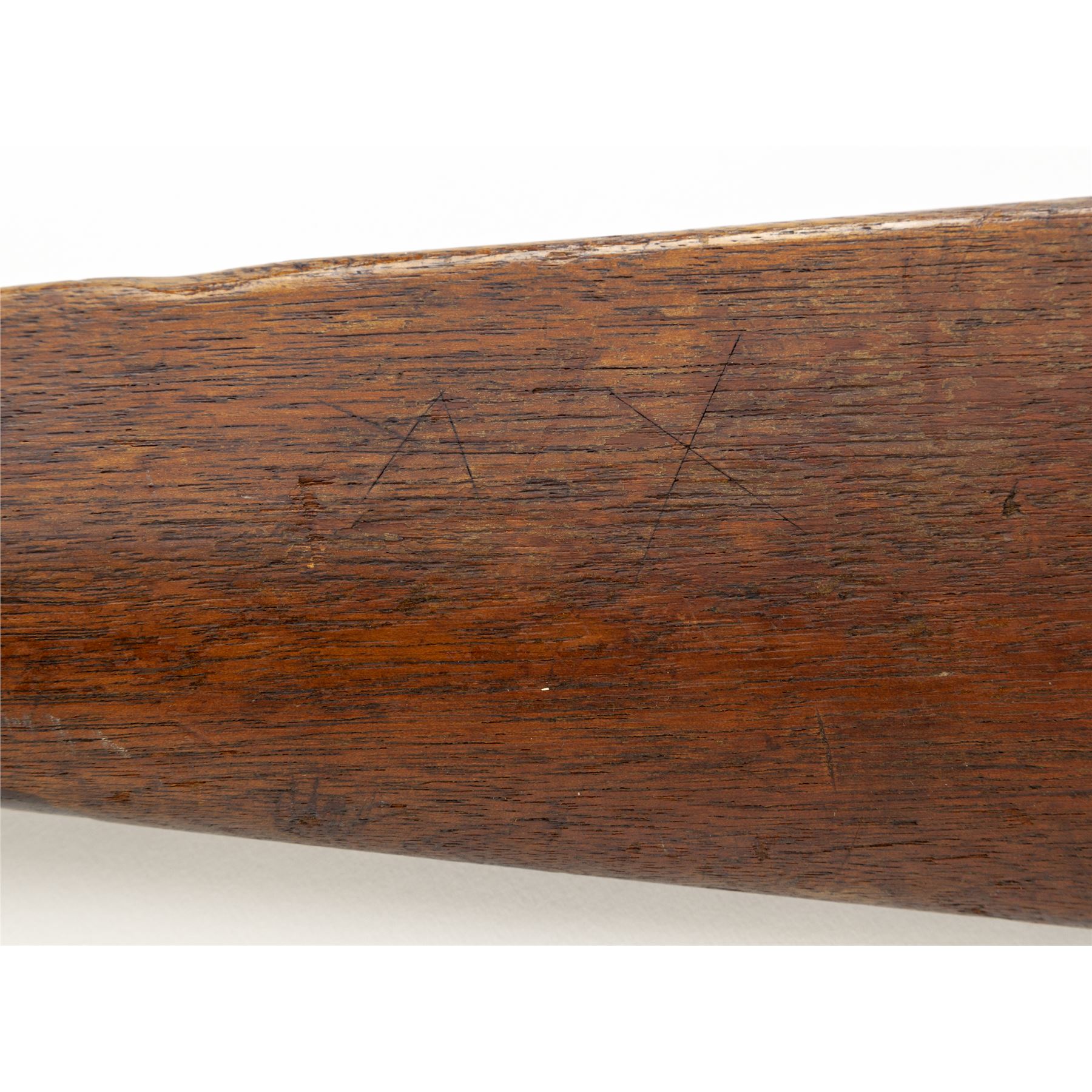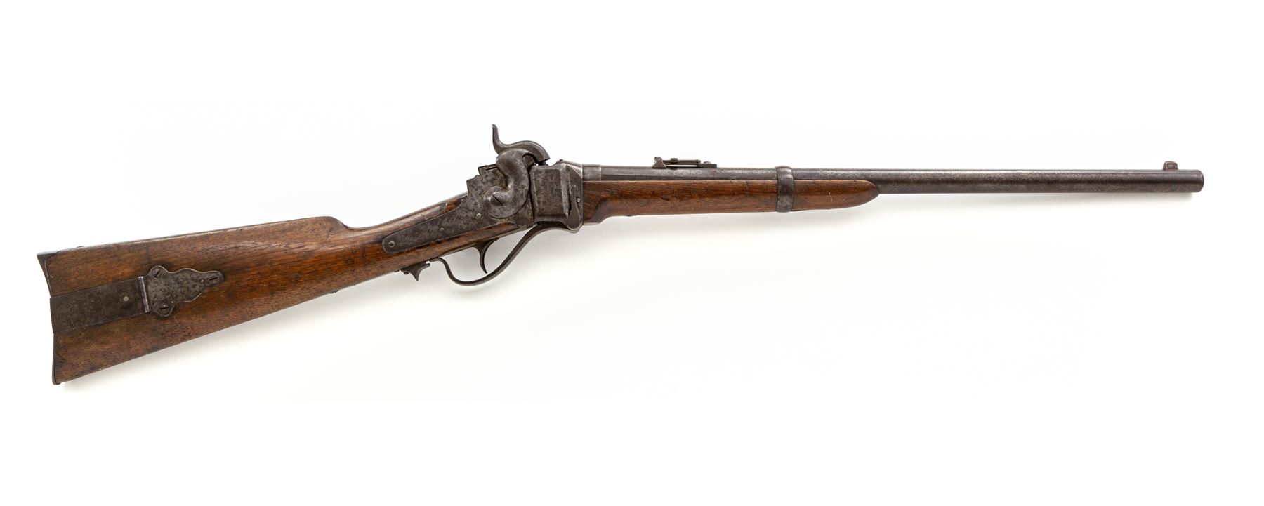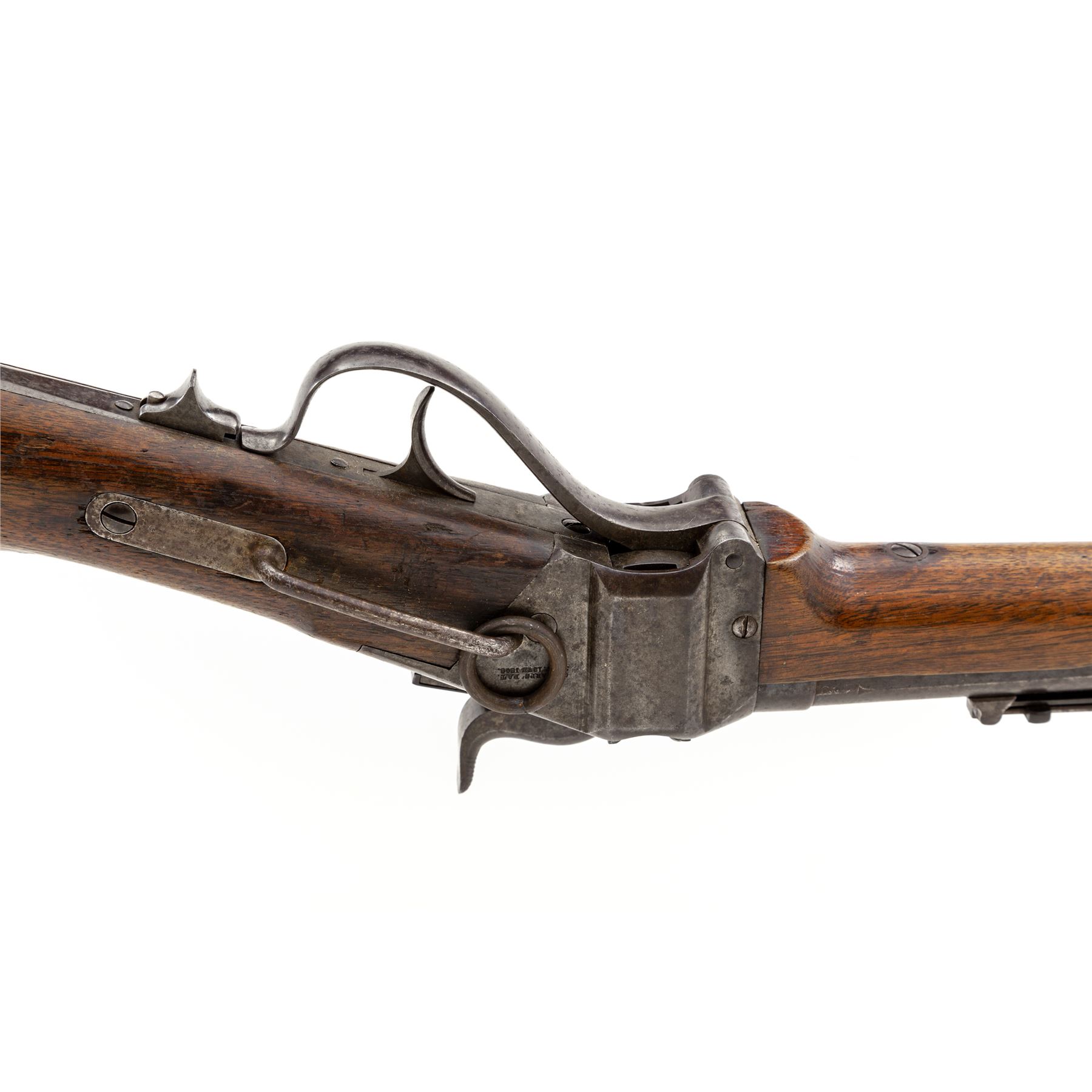 Civil War Sharps ''New Model 1859'' Percussion Saddle Ring Carbine, with Pellet Priming System, #59774, .52 cal., 22'' round barrel, with integral block-blade front and Lawrence patent sliding-leaf rear sights marked ''Sharps Rifle/Manufg. Co./Hartford, Conn.'' behind single spring-retained barrel band, and ''New Model 1859'' at breech; ''Straight Breech'' receiver is marked ''C. Sharps Pat./Sept. 12th, 1848'' and fitted with a sling bar and ring on left side, and marked ''C. Sharps' Pat./Oct. 16th, 1852'' and ''R.S. Lawrence Pat./April 12th, 1859'' on right; serpentine operating lever opens the dropping-block action for loading prepared cartridges, and cleaning; steel patchbox and carbine-style buttplate; oil-stained walnut forend and buttstock. Mfg'd ca. 1859-66. Condition is very good, the barrel with approx. 20% original blue mixing with brown patina and scattered discoloration, the other parts being mostly smooth gunmetal gray with scattered discoloration. Stocks are sound with marks from military use and age. Edges and markings are crisp; action functions smoothly; 6-groove bore is clean with occasional spotting and defined rifling. Est.: $1,000-$1,500. (Antique)
