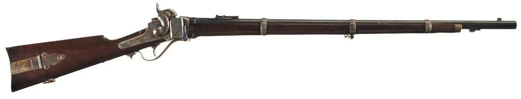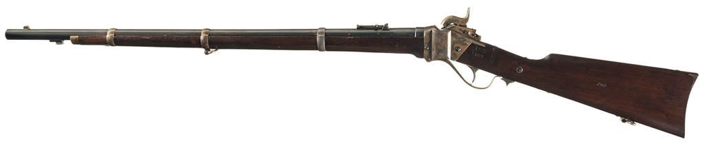Manufactured by the Sharps Rifle Manufacturing Co. of Hartford, Connecticut circa 1862-1863 and subsequently refurbished to new condition at the close of the Civil War. The rifle has a blue barrel, casehardened receiver and furniture with an oil finished walnut stock and forearm. The screws and small components have a fiery niter blue finish. The bottom of the barrel has a lug for a saber bayonet. The barrel has a block mounted nickel silver front sight blade and a R.S. Lawrence patent folding leaf rear sight with a 900 yard center notch. The receiver retains the complete Lawrence pellet primer. The stock has a casehardened patch box and buttplate. The upper receiver tang is stamped with the serial number "57773" and the underside of the barrel is serial numbered "C39394". The ribbon shaped "DFC" final inspection mark used on metallic cartridge conversions of Sharps rifles and carbines is stamped in the center of the left side of the stock. Two horizontal and one vertical Ordnance inspection stamps with script initials and rectangular borders stamped on the left stock wrist. Single letter and multiple initial Ordnance sub-inspection marks are visible on the barrel, forearm, stock and most major components. The top of the barrel is marked with the three line Sharps Hartford address ahead of the rear sight and "NEW MODEL 1863" at the breech. The rear sight base is stamped with the correct "R.S. LAWRENCE" patent marking. The two line Sharps 1848 patent date is stamped on the left side of the receiver. The upper receiver has the two line Lawrence patent markings below the pellet primer and the two line Sharps 1852 patent markings are located on the lock plate.