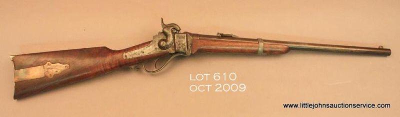 Sharps New Model 1859 percussion carbine, .54 cal., 22” round barrel, #48714. This gun is in overall good + condition showing a pleasing patina on metal surfaces, good bore, action, markings and wood stocks with patchbox and saddle ring andbar; wood butt stock has better-than-average graining and there are scattered nicks and mars from carry and storage. Est.: $1,500-$3,000.