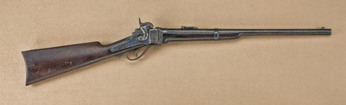 Sharps New Model 1863, .52 caliber percussion carbine, serial #C19990. The carbine remains in good condition showing 20-30% old arsenal type military blue refinish, Sharps Rifle Company address and New Model mostly visible. The stock shows some dings, mars, scratches and dents, some deep marks, particularly right over the trigger on the left side, most of cartouche beneath the saddle ring bar, the saddle ring plate shows some pits and marks on the edges, generally fair to good overall. The action is good and tight, the bore is very good. Most probably refinished and reissued after the Civil War. Est: $1,250 - $2,500