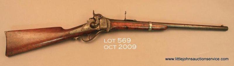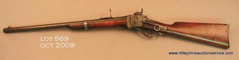 Sharps New Model 1863 conversion carbine, 50-70 cal., 22” round barrel, blue and case hardened finish, wood stocks, #C17650. This gun is in overall good to very good condition showing traces of original blue in protected areas of barrelwith balance to a brown patina, silvery case color to frame and lever, good bore, crisp action; wood is overall good with period wear, some dents, nicks and mars, saddle ring and bar retained. Est.: $1,500-$3,000.