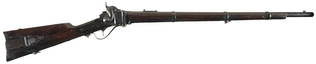 This is 1 of only about 1,000 New Model 1865 rifles manufactured. It is estimated that there were only 1,086 rifles converted for cartridges, making this example even more rare. This example has a blade front sight and an "R.S. LAWRENCE" marked rear sight on the barrel which has 6 groove rifling. The lock plate is stamped with the Sharps patent marking and is also stamped with the R.S. Lawrence patent marking by the tape primer. Mounted with a smooth walnut forearm secured with an end cap and 3 bands, and a straight grip walnut stock with patch box, a small brass disc stamped "52" and a curved steel buttplate.