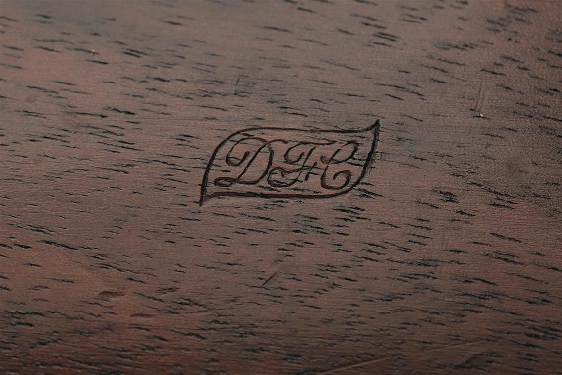 This is an example of one of the percussion Civil War carbines converted during the Indian Wars that was to fire the .50-70 center fire cartridge. This carbine has the relined three groove barrel. These carbines were refurbished by Sharps during the conversion process and if needed the stocks were replaced with ones not having a patch box, which is the case with this example. The barrels were blue with casehardened barrel band, receiver, lever, hammer, and buttplate. The sling bar and ring were finished bright. The carbine has a brass front sight blade and folding, adjustable leaf rear sight with Lawrence patent marked base and graduated to 800 yards, and the percussion Lawrence pellet priming system. The barrel is absent of the standard New Model marking and there is a small "G" and "J" on the left rear flat. The receiver and lock have the standard Sharps and Lawrence patent markings, (fading on the left side of the receiver). Mounted with a smooth oil finished black walnut forearm and straight grip stock with the "DFC" ribbon cartouche on the left side of the stock and an iron carbine buttplate.