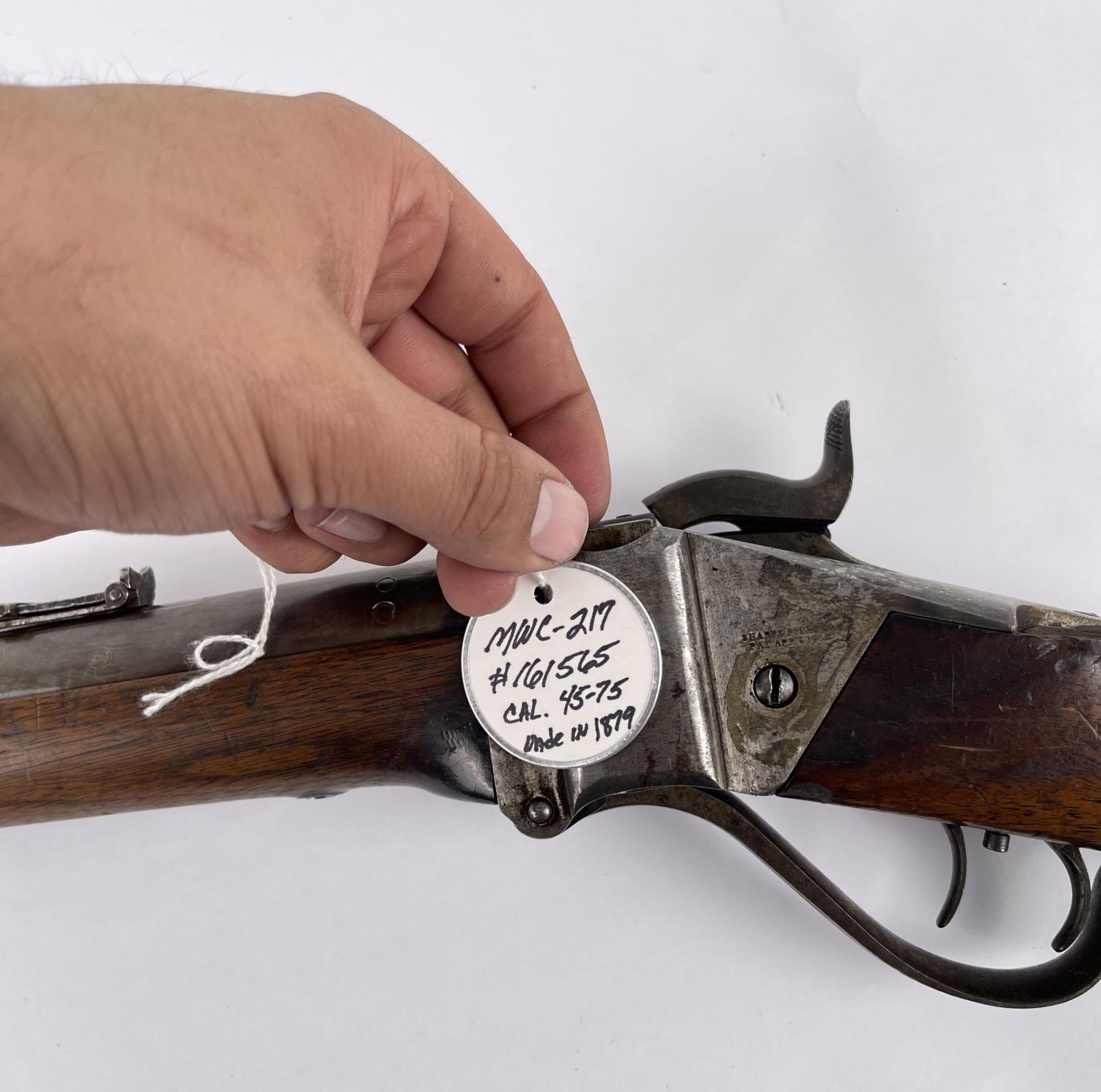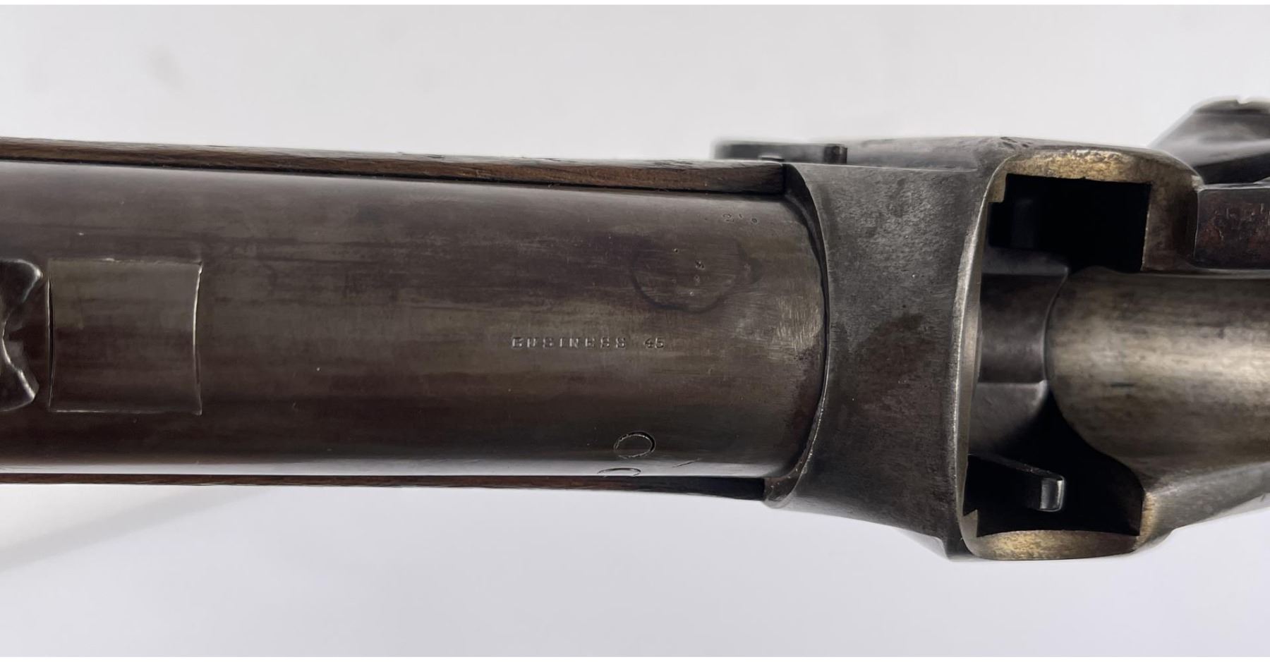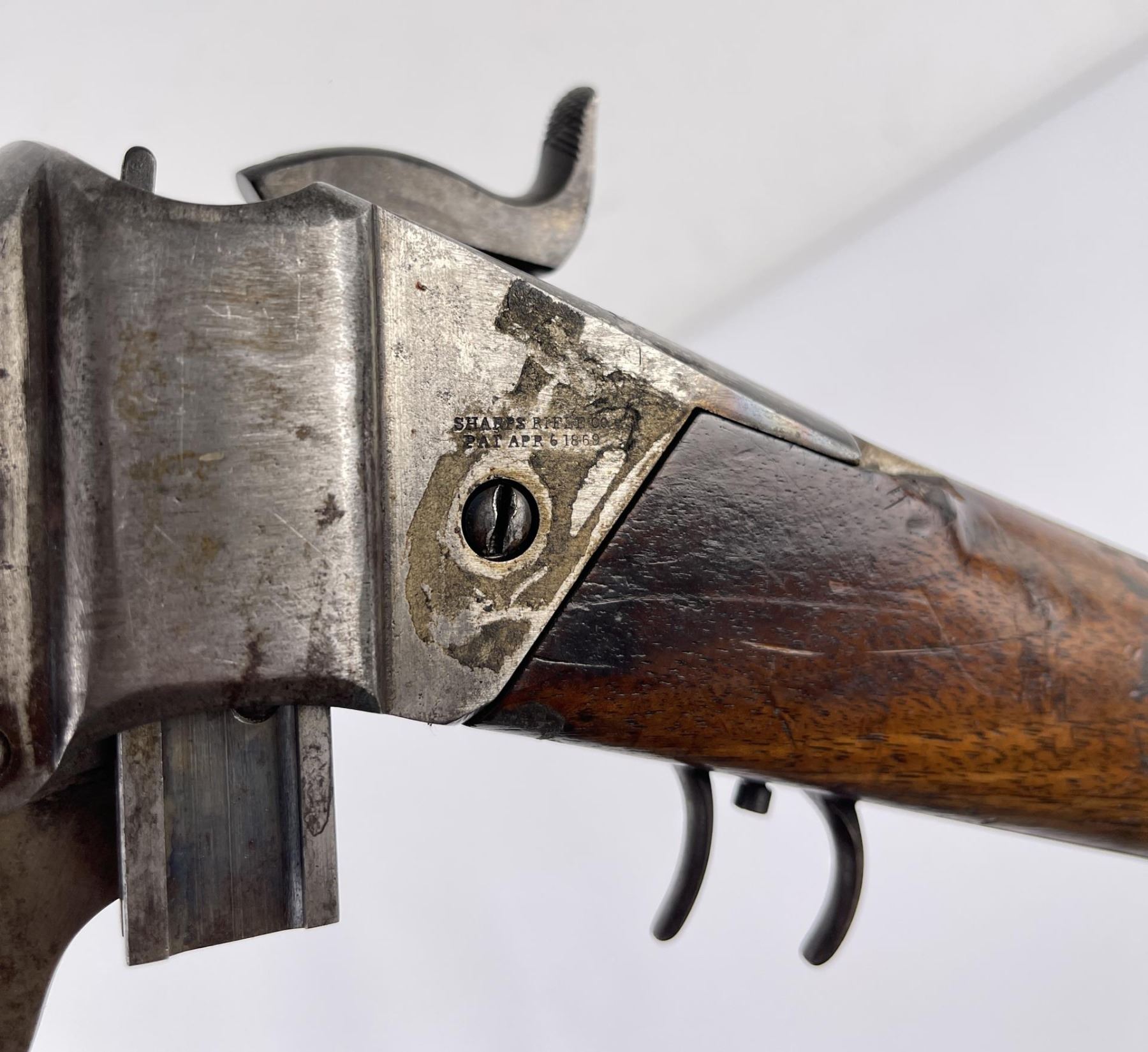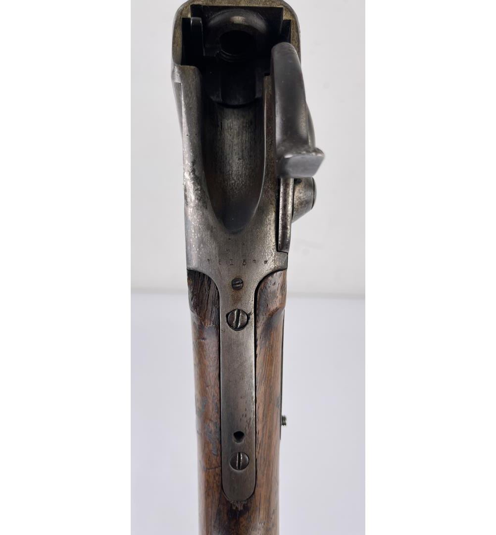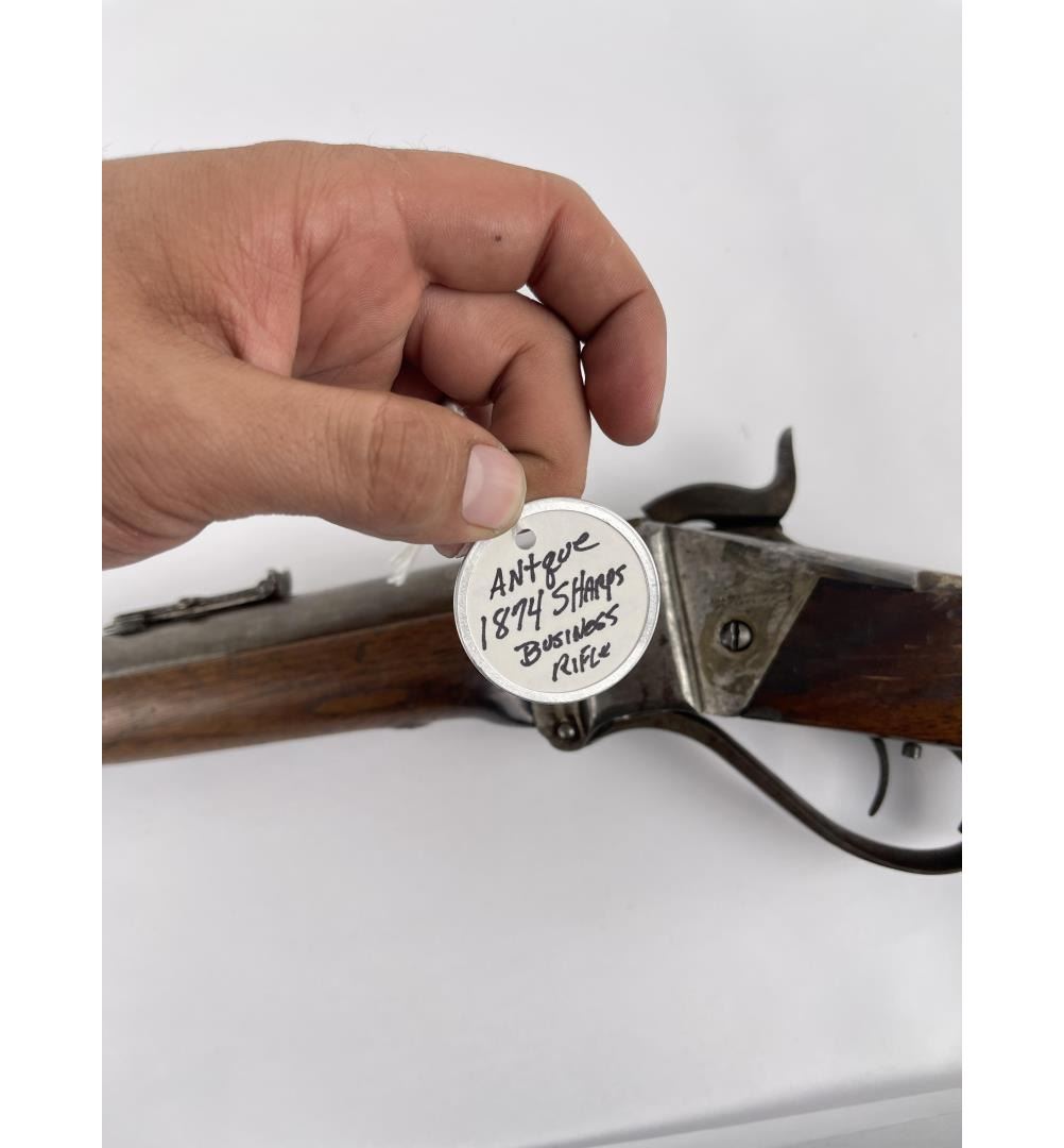 #161565 made in 1879 per Sharps Original Records (R.L. Moore, Jr.). 28" Round Barrel stamped "Old Reliable" in a clipped corner cartouche, Sharps Rifle CO. Bridgeport Conn., Business 45. Right side of barrel has a small 2’ 10 stamped on it. The left side of barrel has signs of having more than one rear sight as along with current sight there is another dovetail (now filled) cut in the barrel closer to the receiver. Also there are 3 holes (now filled) drilled into the left side of the barrel whose positions form sort of an elongated triangle. These may have been the rear mounts for a long brass scope with the front sight dovetail providing the other point of attachment. All above filled areas appear to have been professionally done. The left side of receiver is stamped "Sharps Rifle CO. Pat April 6, 1869". The right side has no markings. The upper tang of the receiver has been drilled to mount a Creedmore Type Tang Sight. Forward mount of Tang Sight covered part of the serial number 161565. Only 15 was clearly visible, the others very faint due to wear. The forward edge of the stocks comb shows wear from the tang sight being flipped back to rest on it. It has double-set triggers which are correct for this model. Matching serial numbers on the receiver and barrel (underneath forearm). The forearm shows definite pommel wear from being carried across a saddle and is located just behind the front screw of the forearm. This is also the “balance point" for this firearm. An old period chip out of the stock on corner near the receiver’s top left side (serial # area). Approximately only 1604 made of this model. The Sharps was purchased many years ago from Darrel Emmett, an old time gun dealer and collector from Glendive, Montana. This Sharps shows use as definitely having “been there" and is of the type a person wishes “could talk". Action is still working. No FFL Transfer Required.
