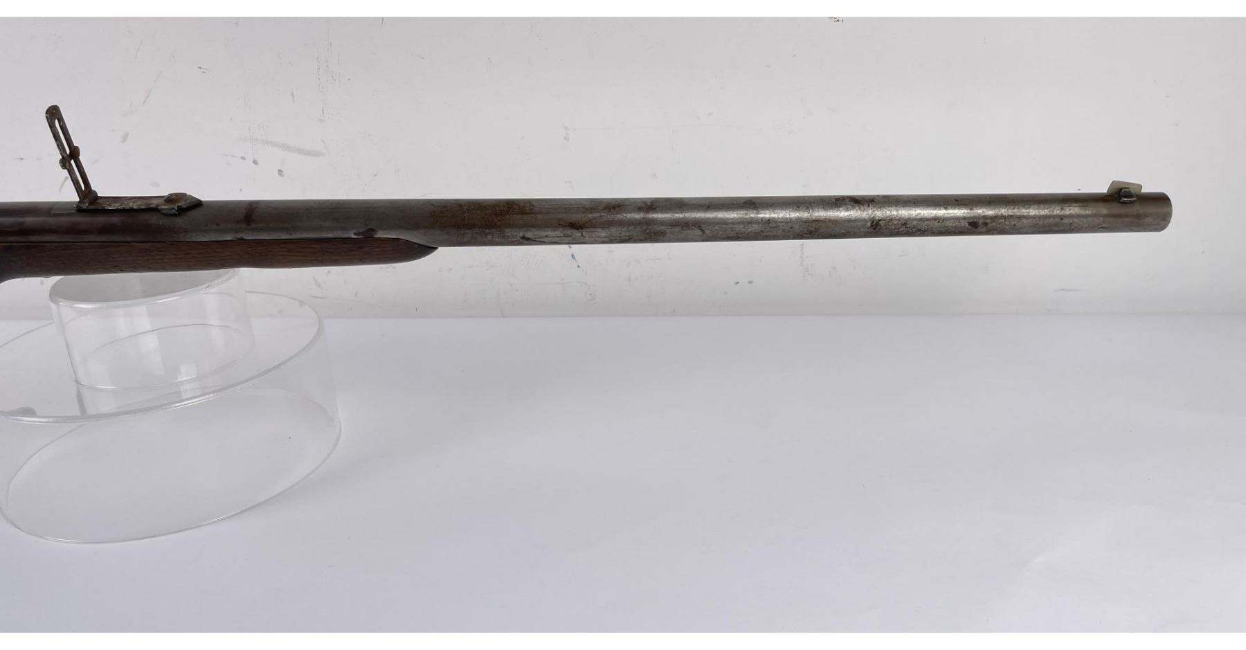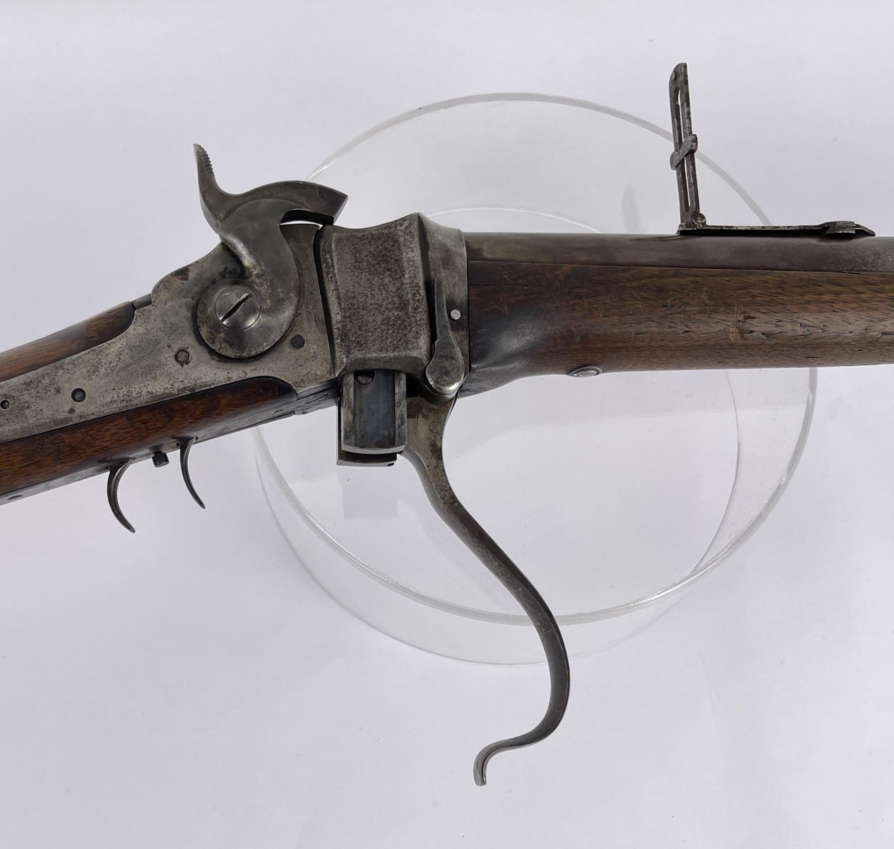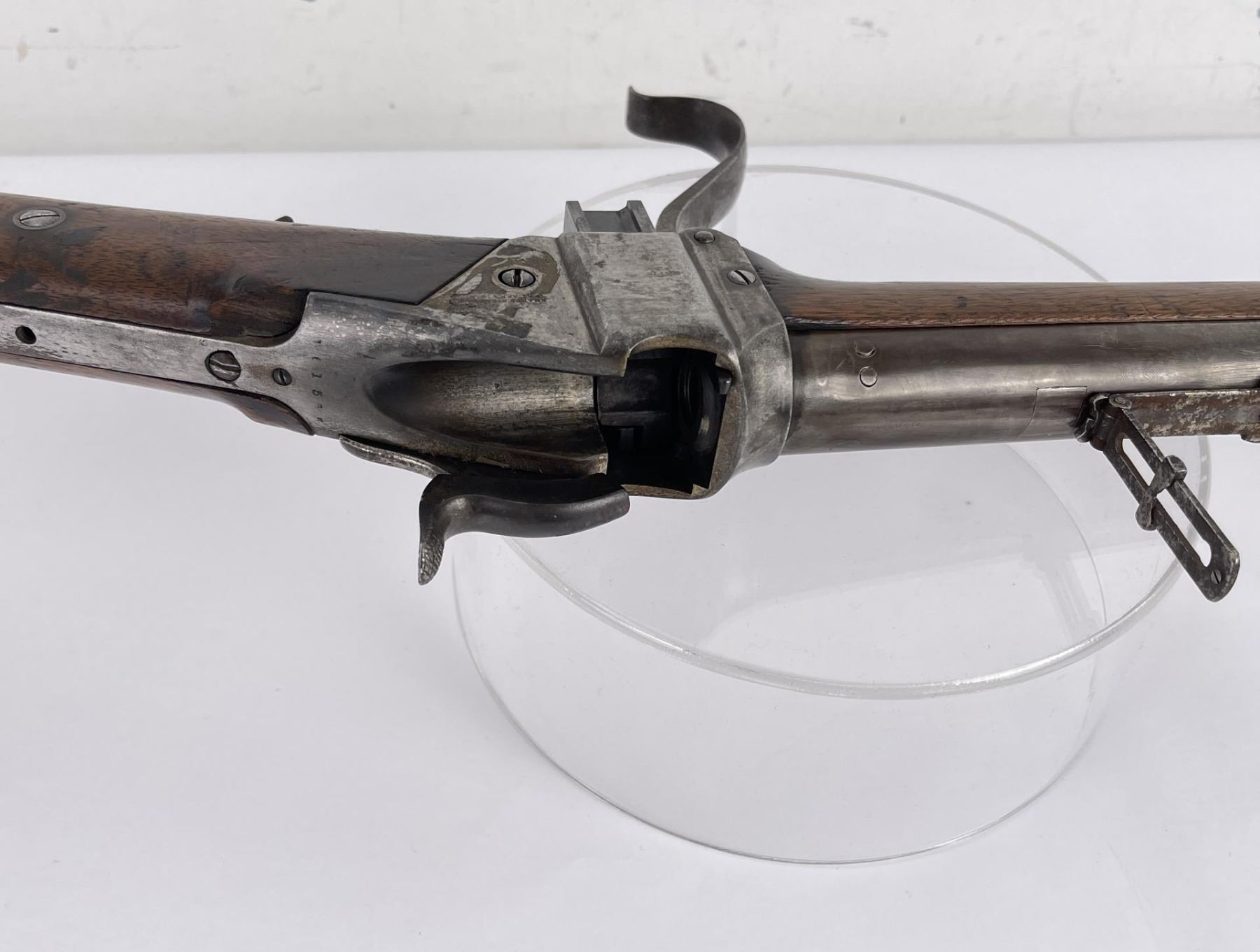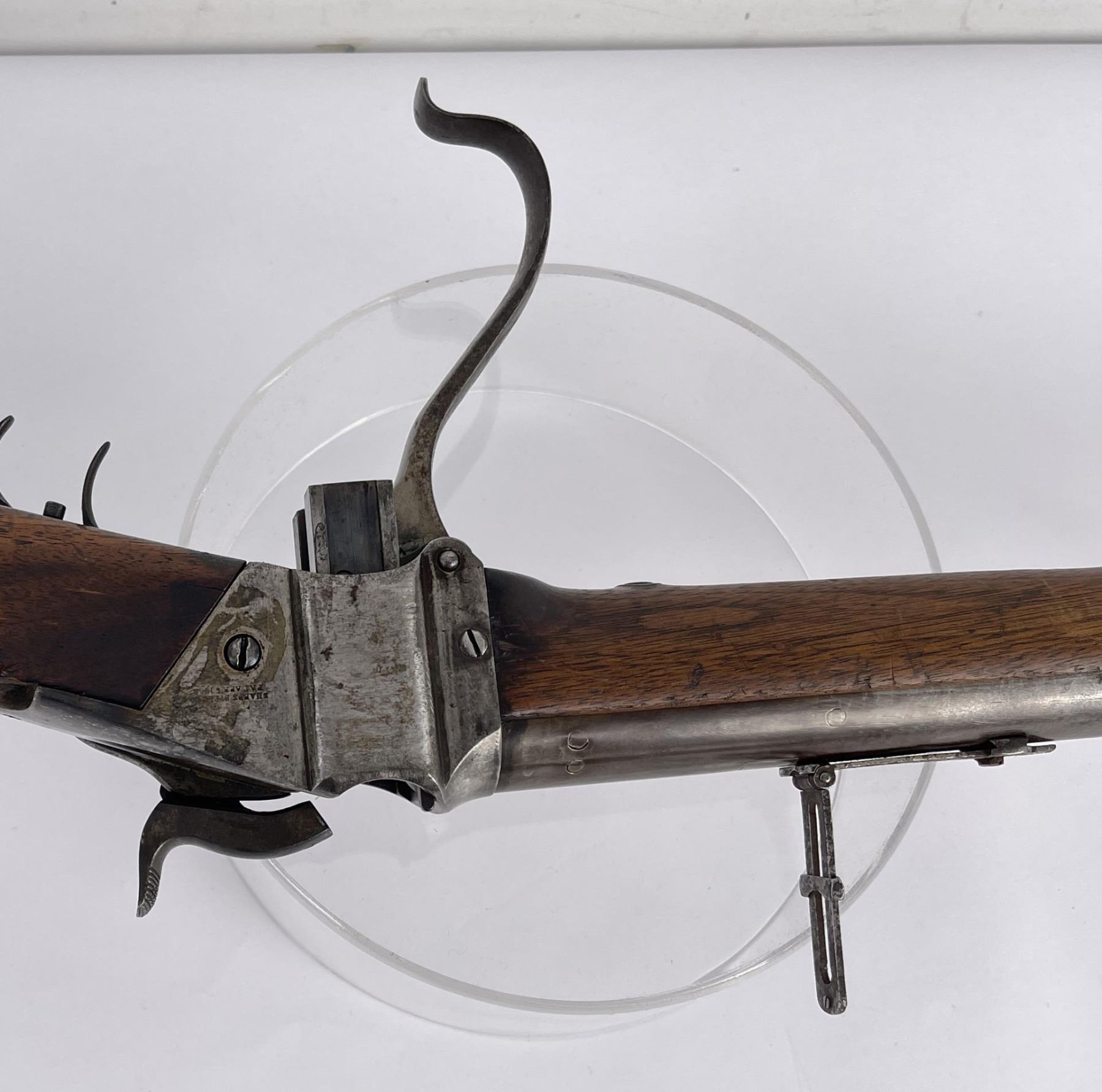 #161565 made in 1879 per Sharps Original Records (R.L. Moore, Jr.). 28" Round Barrel stamped "Old Reliable" in a clipped corner cartouche, Sharps Rifle CO. Bridgeport Conn., Business 45. Right side of barrel has a small 2’ 10 stamped on it. The left side of barrel has signs of having more than one rear sight as along with current sight there is another dovetail (now filled) cut in the barrel closer to the receiver. Also there are 3 holes (now filled) drilled into the left side of the barrel whose positions form sort of an elongated triangle. These may have been the rear mounts for a long brass scope with the front sight dovetail providing the other point of attachment. All above filled areas appear to have been professionally done. The left side of receiver is stamped "Sharps Rifle CO. Pat April 6, 1869". The right side has no markings. The upper tang of the receiver has been drilled to mount a Creedmore Type Tang Sight. Forward mount of Tang Sight covered part of the serial number 161565. Only 15 was clearly visible, the others very faint due to wear. The forward edge of the stocks comb shows wear from the tang sight being flipped back to rest on it. It has double-set triggers which are correct for this model. Matching serial numbers on the receiver and barrel (underneath forearm). The forearm shows definite pommel wear from being carried across a saddle and is located just behind the front screw of the forearm. This is also the “balance point" for this firearm. An old period chip out of the stock on corner near the receiver’s top left side (serial # area). Approximately only 1604 made of this model. The Sharps was purchased many years ago from Darrel Emmett, an old time gun dealer and collector from Glendive, Montana. This Sharps shows use as definitely having “been there" and is of the type a person wishes “could talk". Action is still working. No FFL Transfer Required.