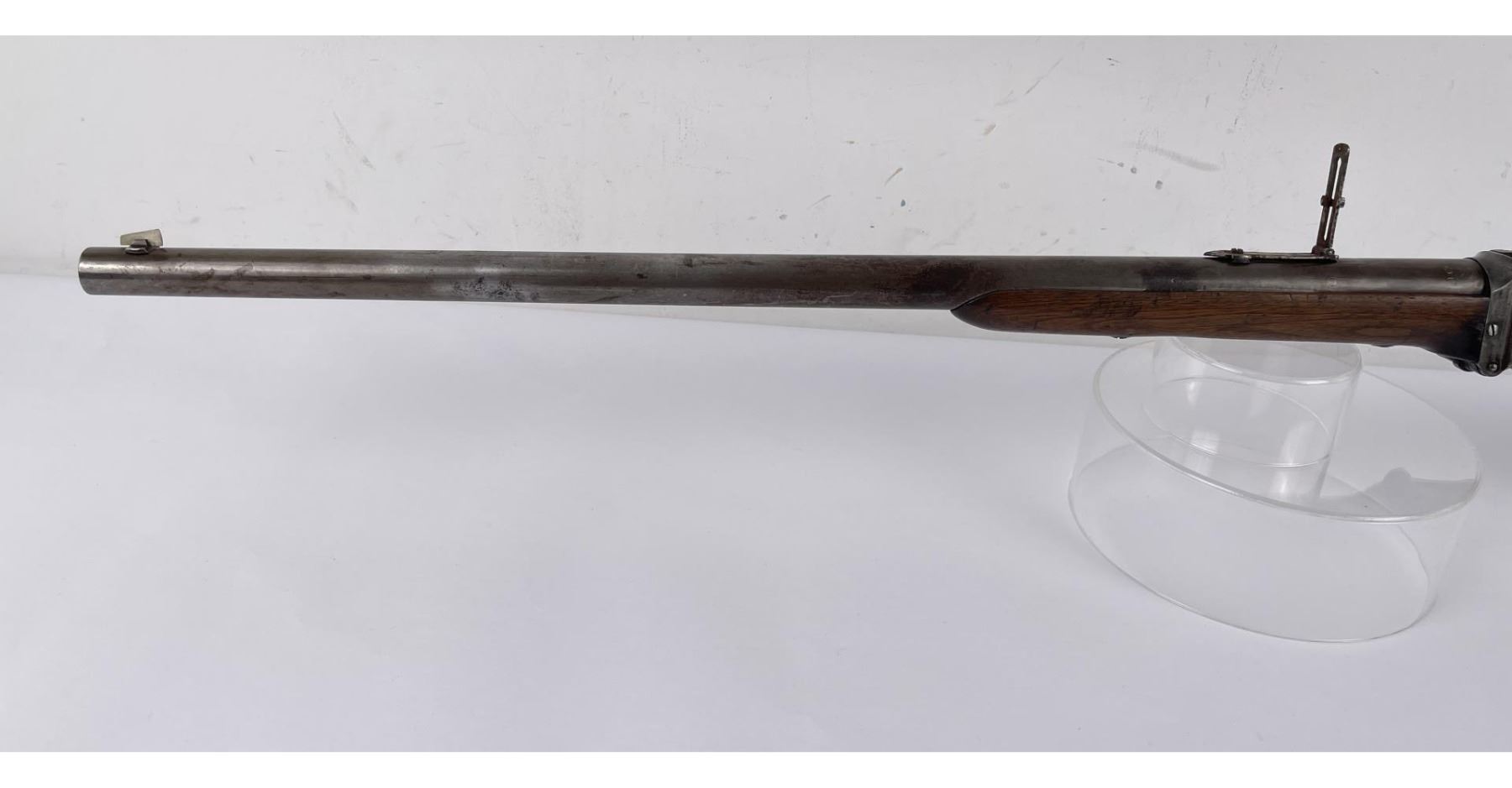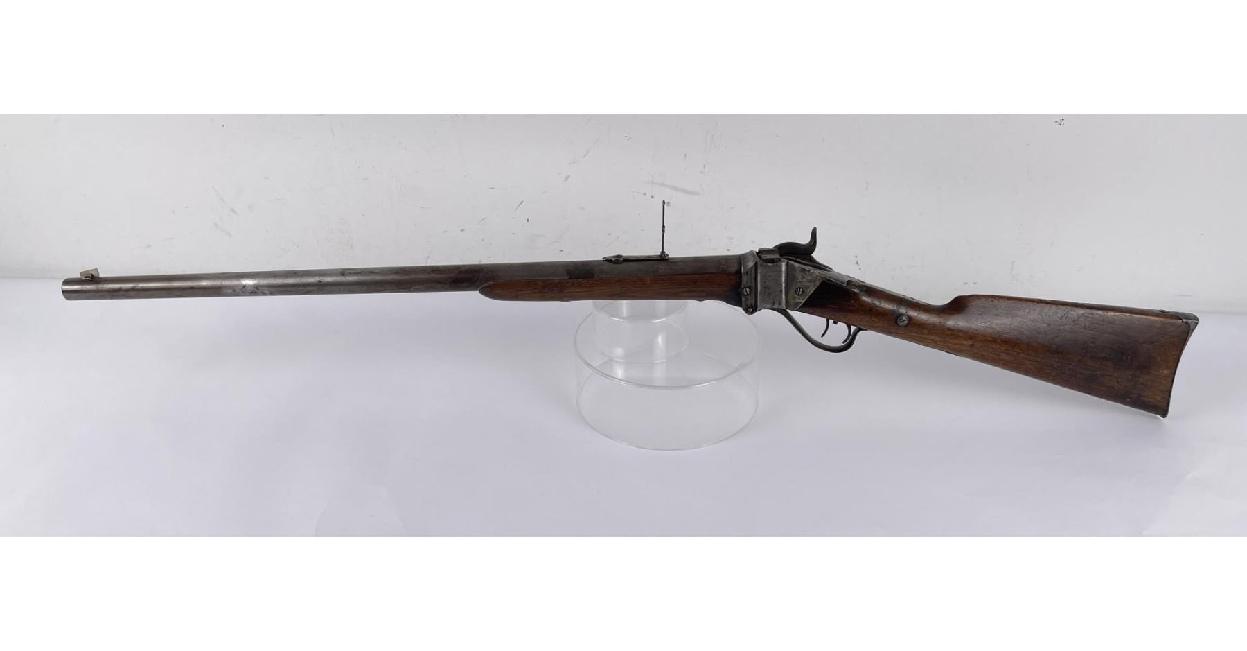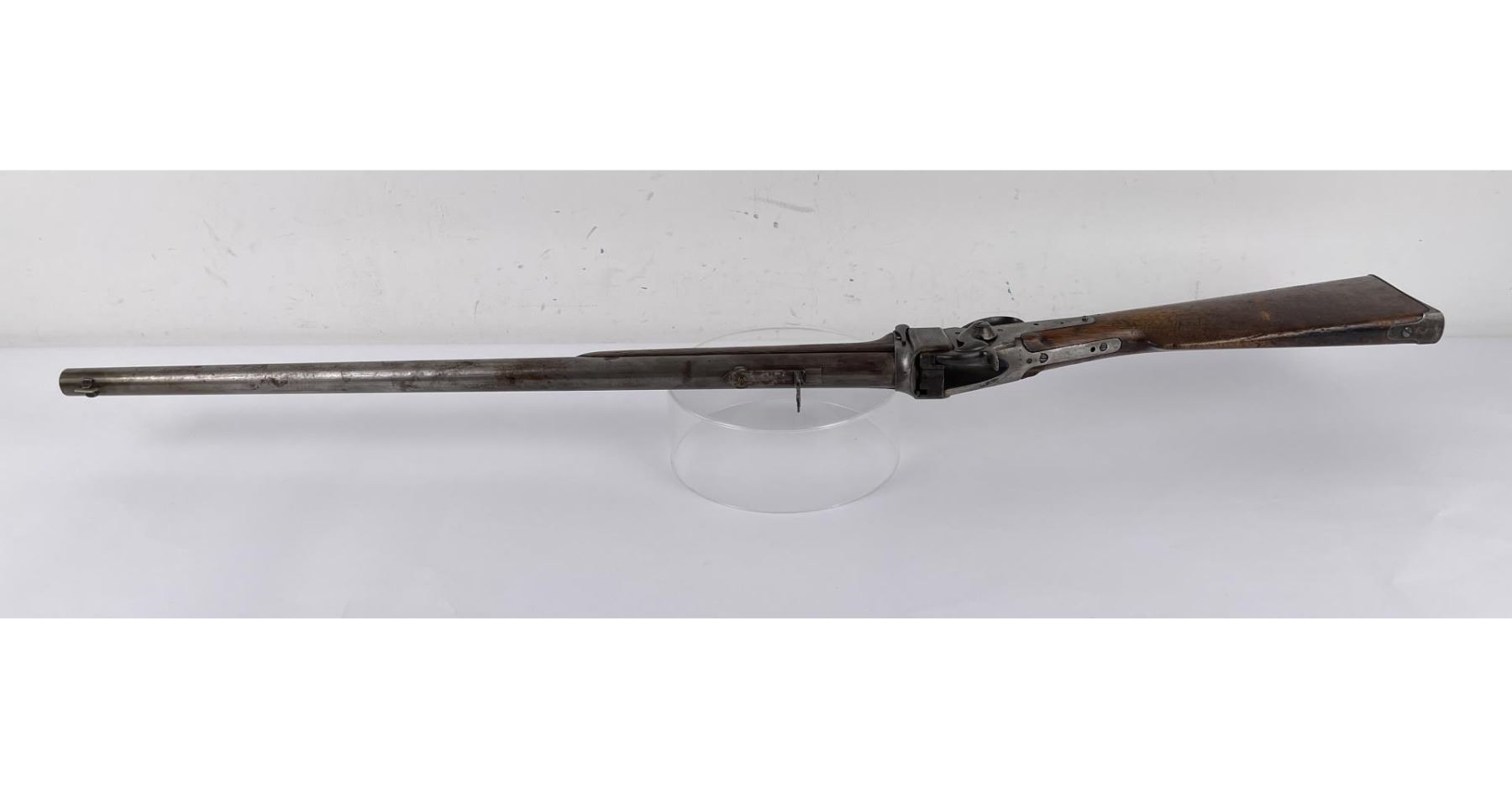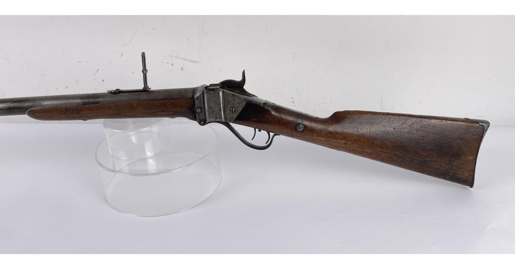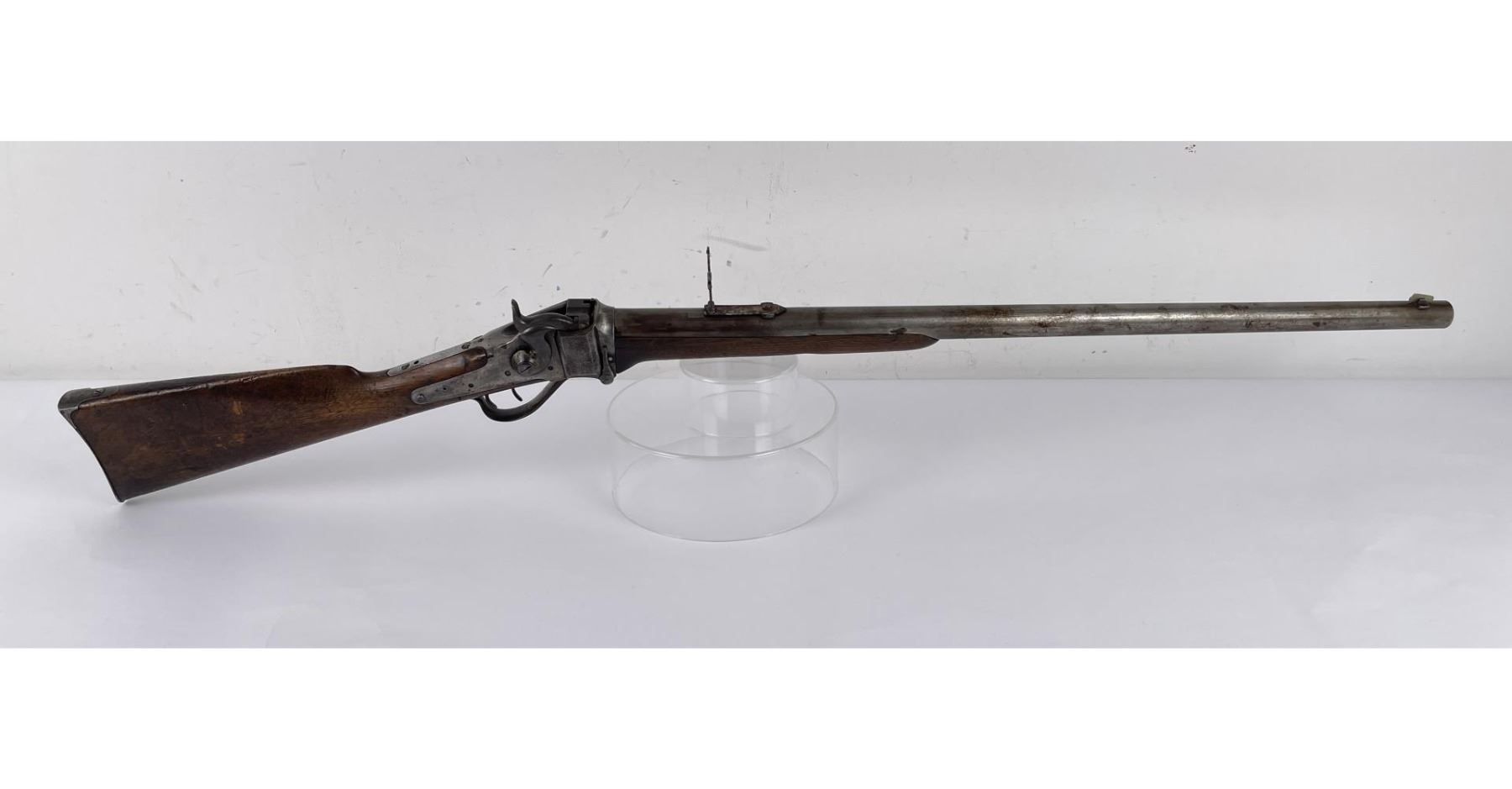 #161565 made in 1879 per Sharps Original Records (R.L. Moore, Jr.). 28" Round Barrel stamped "Old Reliable" in a clipped corner cartouche, Sharps Rifle CO. Bridgeport Conn., Business 45. Right side of barrel has a small 2’ 10 stamped on it. The left side of barrel has signs of having more than one rear sight as along with current sight there is another dovetail (now filled) cut in the barrel closer to the receiver. Also there are 3 holes (now filled) drilled into the left side of the barrel whose positions form sort of an elongated triangle. These may have been the rear mounts for a long brass scope with the front sight dovetail providing the other point of attachment. All above filled areas appear to have been professionally done. The left side of receiver is stamped "Sharps Rifle CO. Pat April 6, 1869". The right side has no markings. The upper tang of the receiver has been drilled to mount a Creedmore Type Tang Sight. Forward mount of Tang Sight covered part of the serial number 161565. Only 15 was clearly visible, the others very faint due to wear. The forward edge of the stocks comb shows wear from the tang sight being flipped back to rest on it. It has double-set triggers which are correct for this model. Matching serial numbers on the receiver and barrel (underneath forearm). The forearm shows definite pommel wear from being carried across a saddle and is located just behind the front screw of the forearm. This is also the “balance point" for this firearm. An old period chip out of the stock on corner near the receiver’s top left side (serial # area). Approximately only 1604 made of this model. The Sharps was purchased many years ago from Darrel Emmett, an old time gun dealer and collector from Glendive, Montana. This Sharps shows use as definitely having “been there" and is of the type a person wishes “could talk". Action is still working. No FFL Transfer Required.