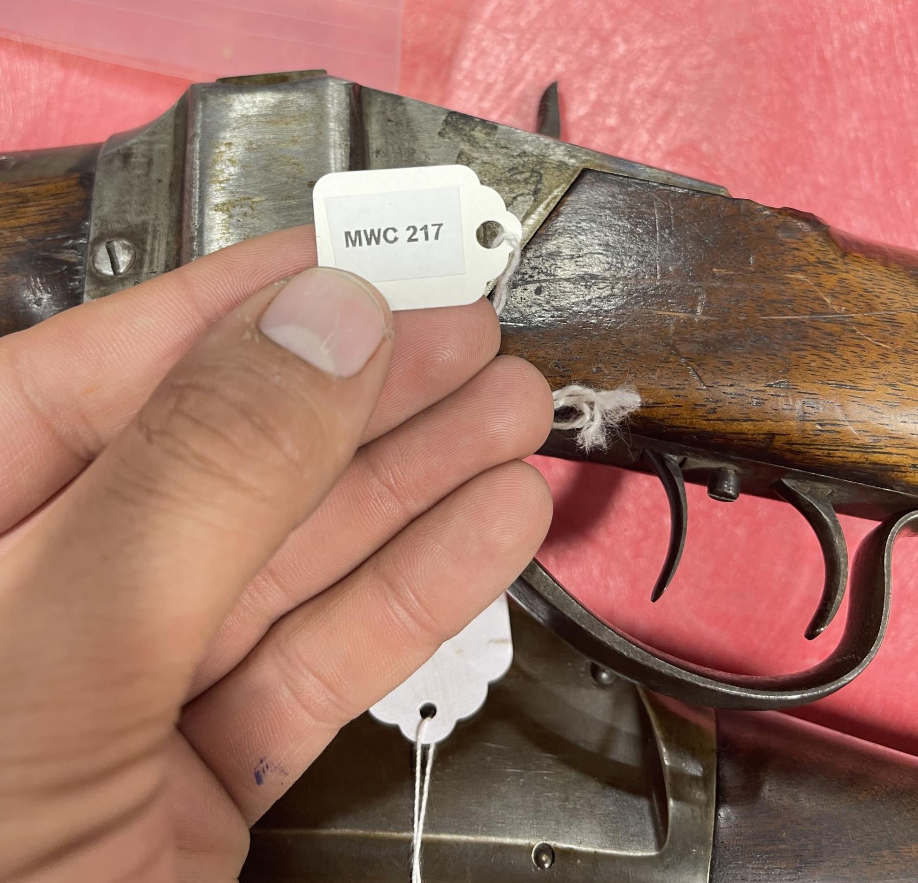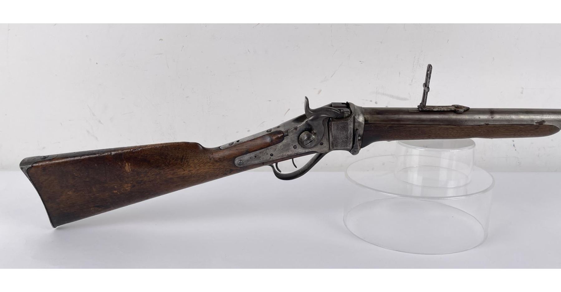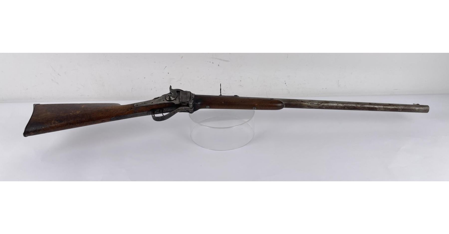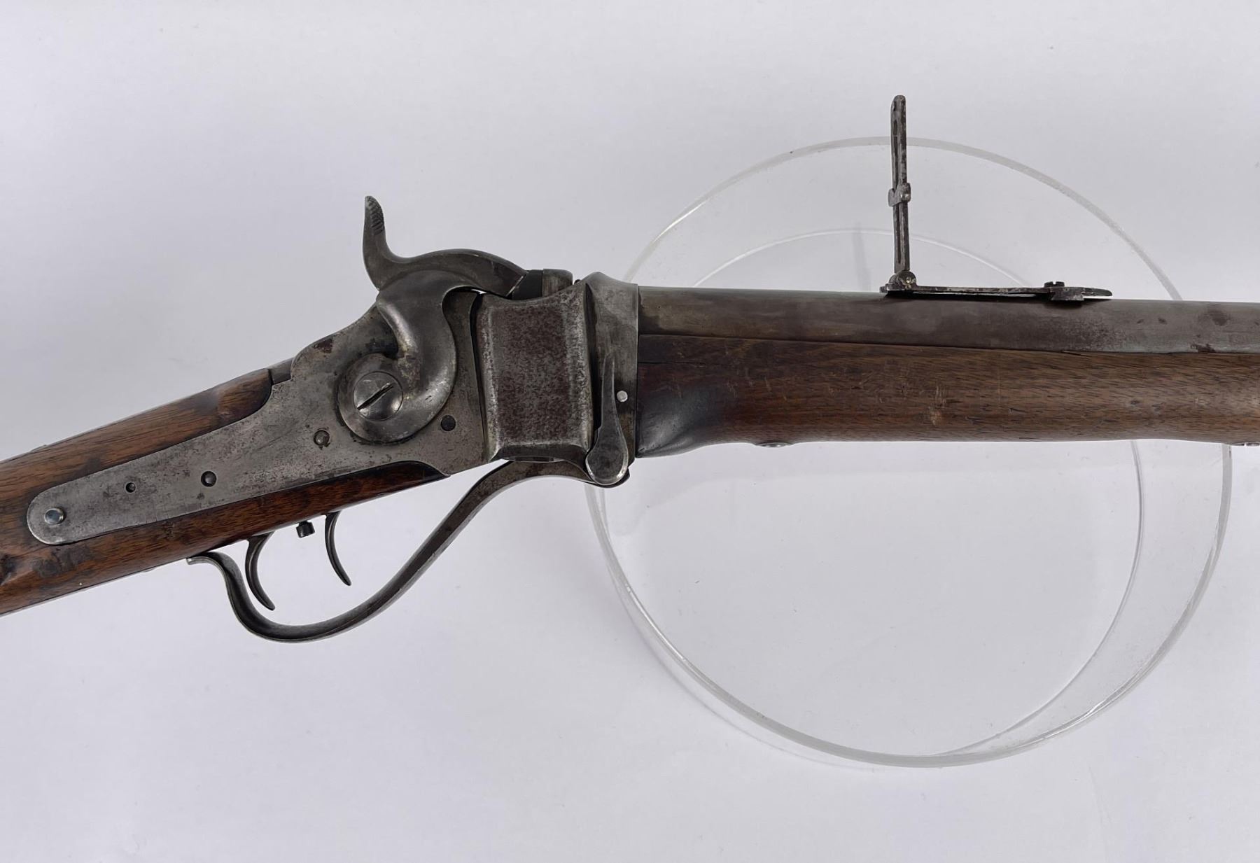 #161565 made in 1879 per Sharps Original Records (R.L. Moore, Jr.). 28" Round Barrel stamped "Old Reliable" in a clipped corner cartouche, Sharps Rifle CO. Bridgeport Conn., Business 45. Right side of barrel has a small 2’ 10 stamped on it. The left side of barrel has signs of having more than one rear sight as along with current sight there is another dovetail (now filled) cut in the barrel closer to the receiver. Also there are 3 holes (now filled) drilled into the left side of the barrel whose positions form sort of an elongated triangle. These may have been the rear mounts for a long brass scope with the front sight dovetail providing the other point of attachment. All above filled areas appear to have been professionally done. The left side of receiver is stamped "Sharps Rifle CO. Pat April 6, 1869". The right side has no markings. The upper tang of the receiver has been drilled to mount a Creedmore Type Tang Sight. Forward mount of Tang Sight covered part of the serial number 161565. Only 15 was clearly visible, the others very faint due to wear. The forward edge of the stocks comb shows wear from the tang sight being flipped back to rest on it. It has double-set triggers which are correct for this model. Matching serial numbers on the receiver and barrel (underneath forearm). The forearm shows definite pommel wear from being carried across a saddle and is located just behind the front screw of the forearm. This is also the “balance point" for this firearm. An old period chip out of the stock on corner near the receiver’s top left side (serial # area). Approximately only 1604 made of this model. The Sharps was purchased many years ago from Darrel Emmett, an old time gun dealer and collector from Glendive, Montana. This Sharps shows use as definitely having “been there" and is of the type a person wishes “could talk". Action is still working. No FFL Transfer Required.