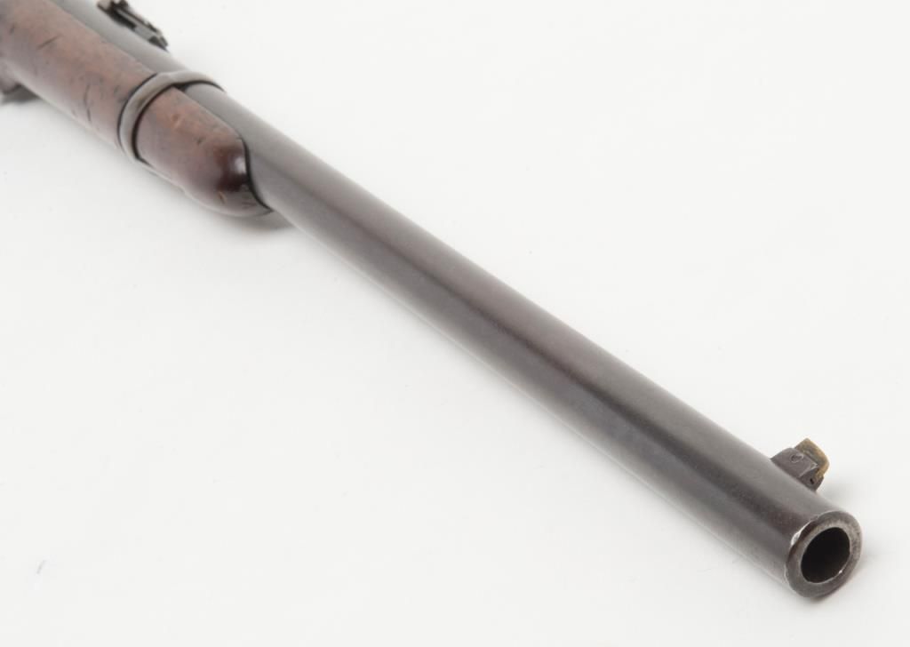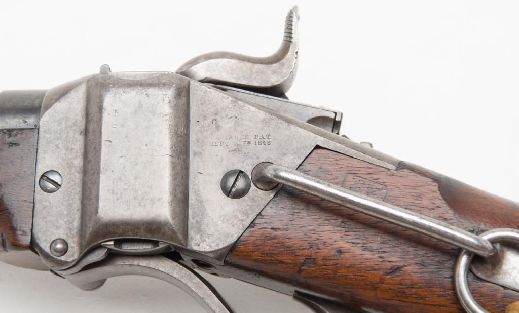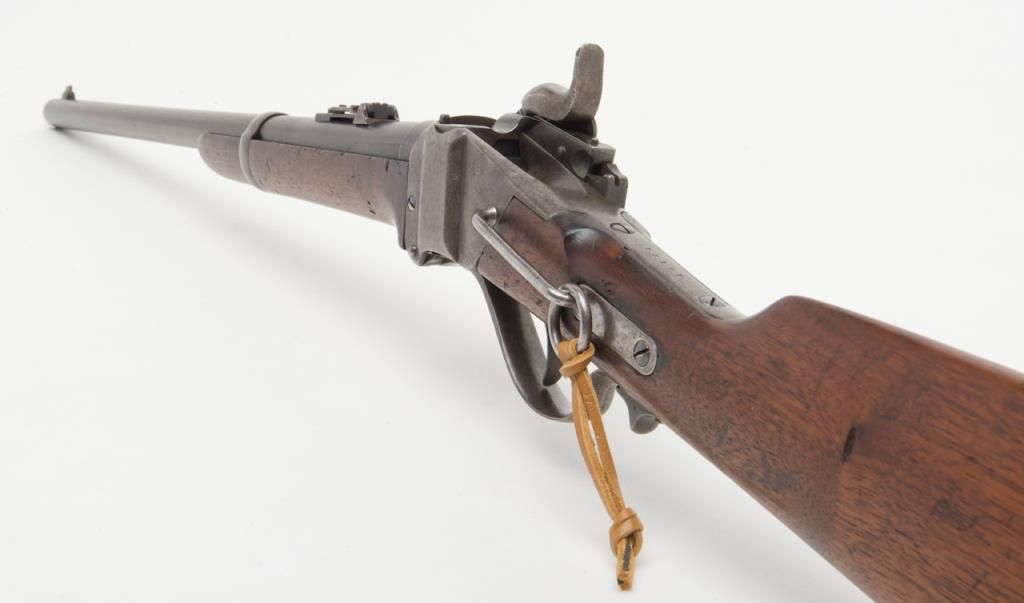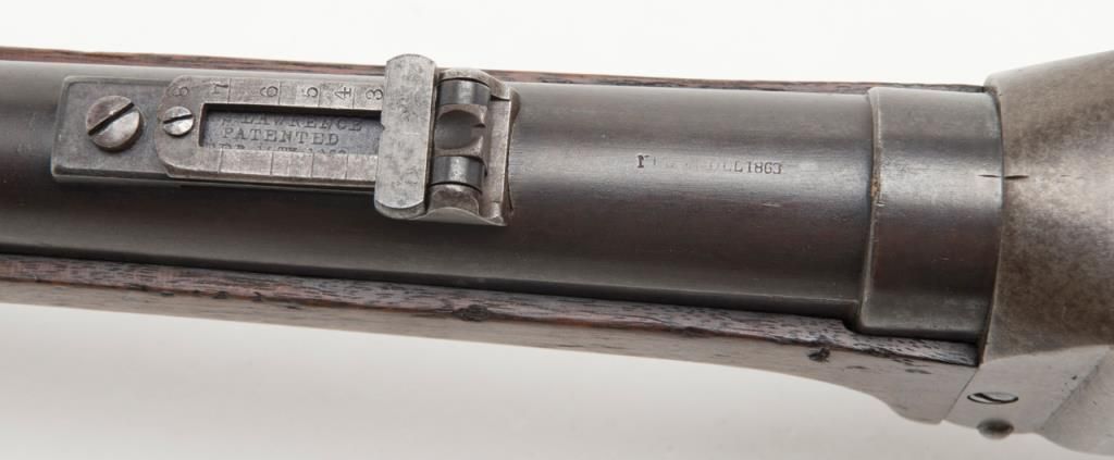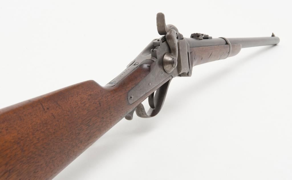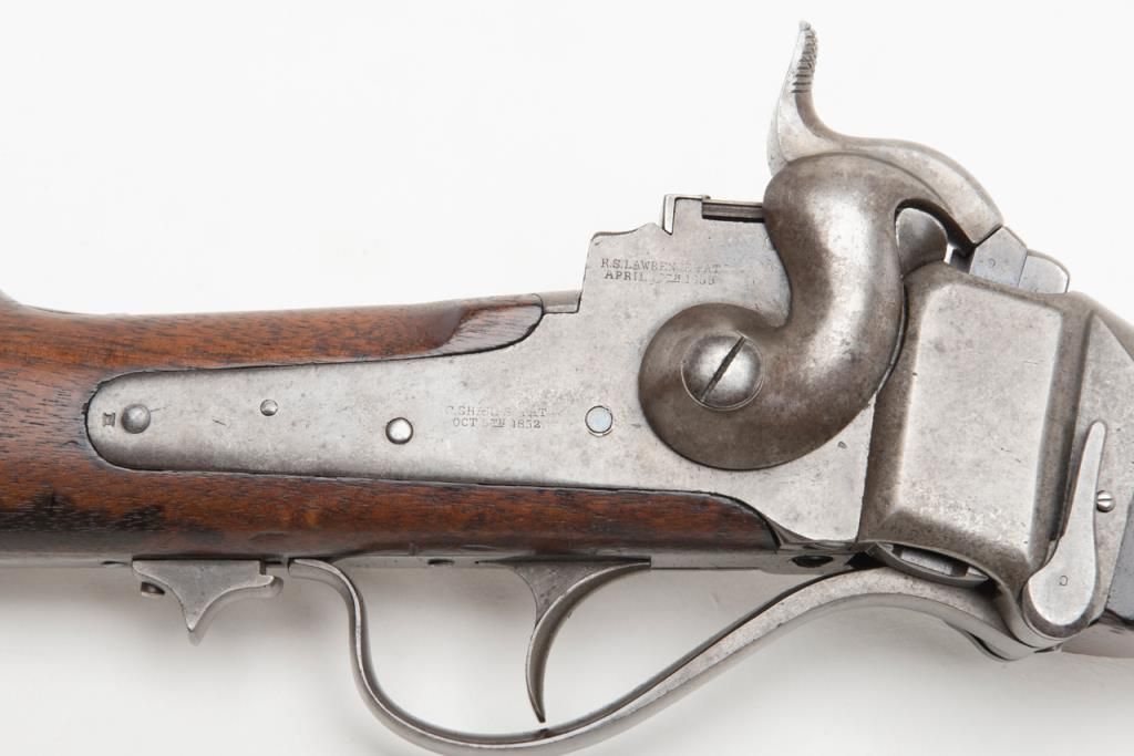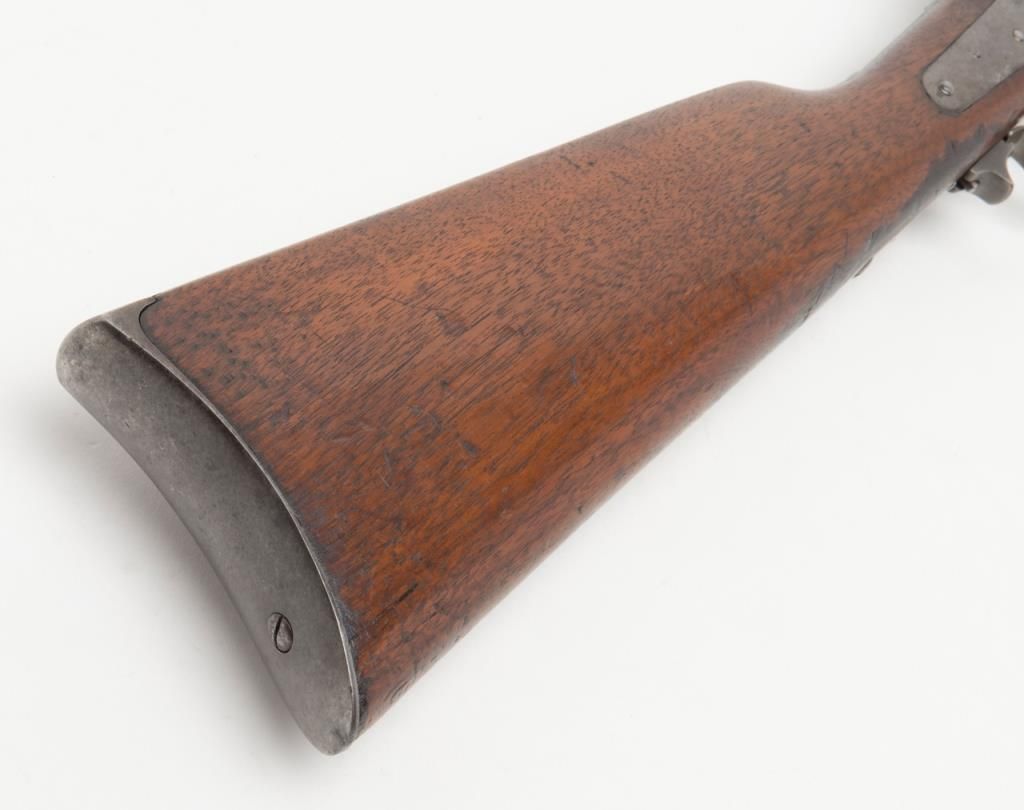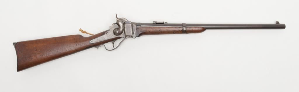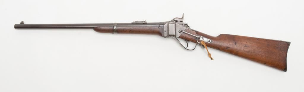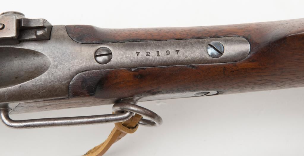 Sharps SRC conversion, .50-70 cal. in overall very good original condition, #72197 showing approx. 85% original blue on barrel evenly drifting and toning with some light erosion just starting; the frame shows approx. 60& case hardening driftingand dulling to grey with some light areas of colors showing but going faint. The stocks are good to very good with some small dings, mars, scratches, gouges, etc.; good cartouche at the center portion of the left butt stock. Themarkings are sharp, all small parts retained, bore is near excellent. These early cartridge conversions went West and more information is being uncovered all the time on them including use by the Texas Rangers; formerly in the Dr.Sterling Fenn collection. (Antique). Est.: $2,200-$4,400.