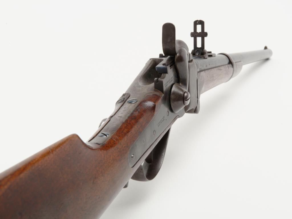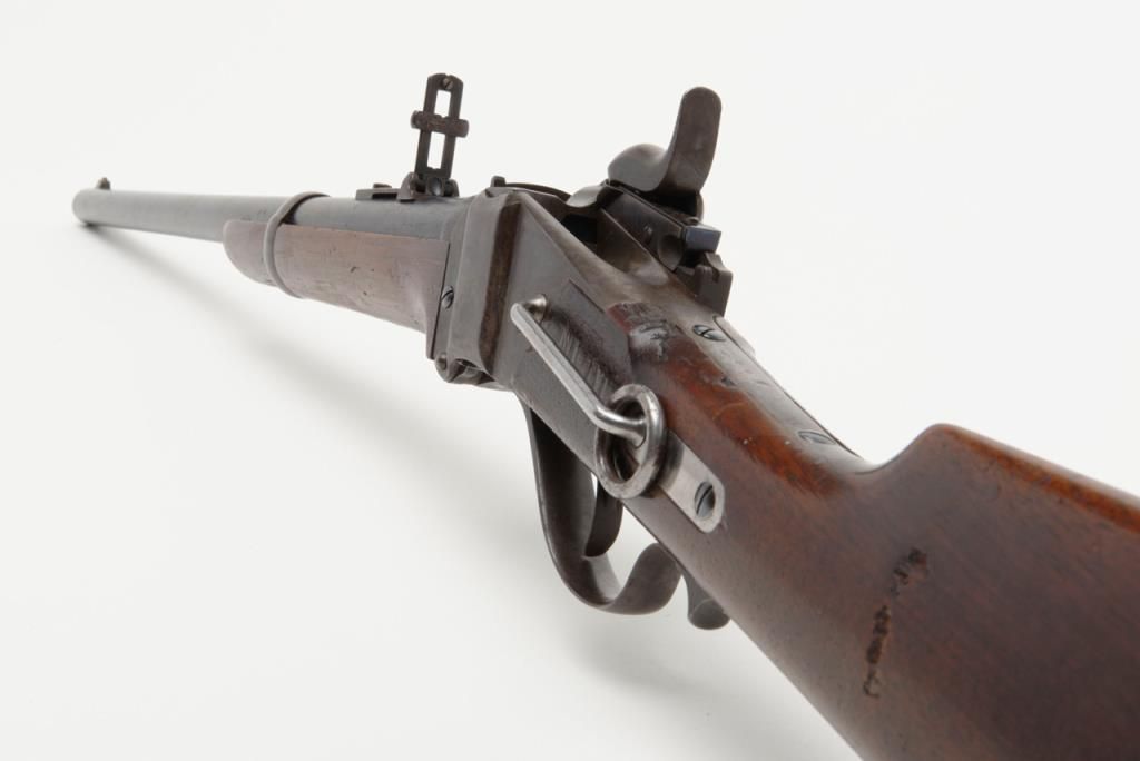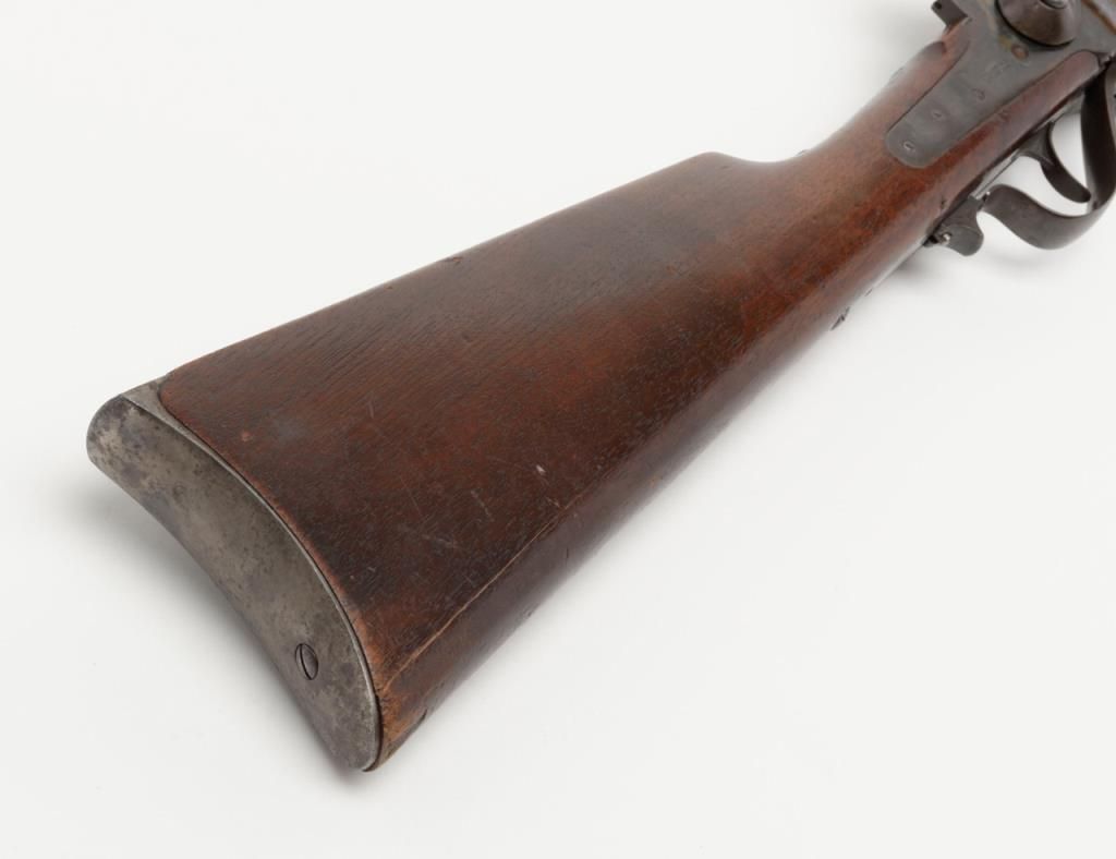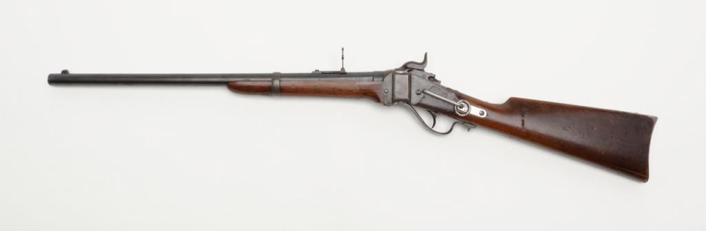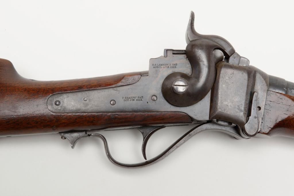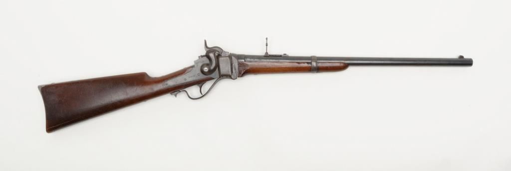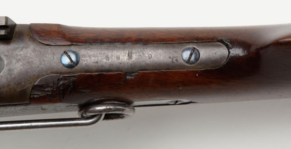 Sharps metallic cartridge conversion SRC to .50-70 cal., 22” round barrel, blue and case hardened finish, wood stocks, #58329 in overall very good to near fine condition showing the majority of its muted military blue finish on the barrel,considerable case colors on the receiver and lockplate that displays the R.S. Lawrence Patent date of April 12th 1859 and the Sharps Patent date of Oct. 5th 1852; fine bore, crisp action, very good markings and wood with some old mars to theright side of the forend and mars, scratches and a crack to the lower portion of the butt stock; inspector cartouches are crisp on the left side of the butt stock; DFC at mid-stock and EF at the saddle ring bar. A very nice Sharps conversionwith a great look. (Antique). Est.: $2,500-$5,000.