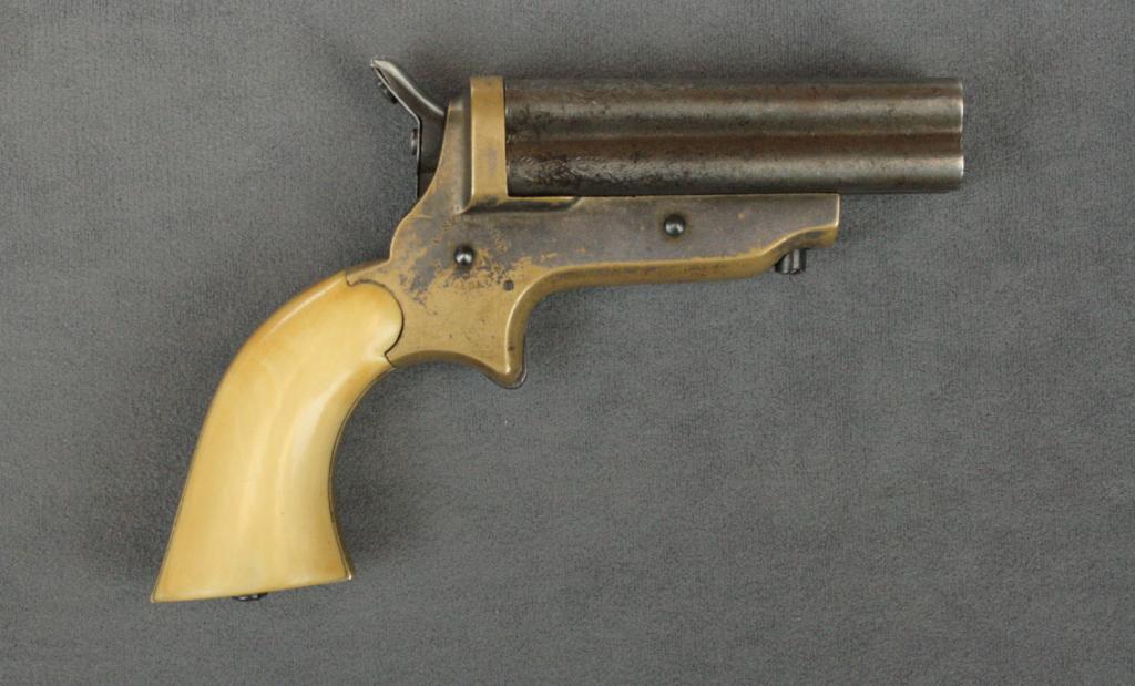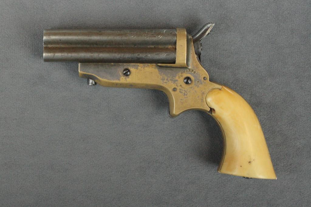 Sharps model 2c .30 cal rimfire 3 inch bbl's pepperbox derringer originaly lightly engraved bbl's with ivory grips serial #3706 pictured in Sharps by Frank Sellers page 146. The bbl's show a slight trace of whatappears to be a gold plating with the balance going to a natural patina with some erosion and pin prick pitting just starting. The frame shows 30 - 40% original darkened and drifted silver plate. The grips are goodother than a chip from top inner edge where grips meet frame. Action good, good overall. Jack Brickell to Tom Seymour Collection. Est. $1,500 - $3,000