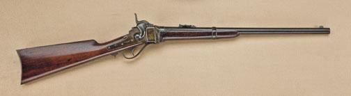 Sharps new model carbine converted to .50-70 cartridge in arsenal manor, serial #C21923. The barrel shows 20-30% original blue mixing with brown, some mottling, beginning aging, and good markings. The lock, action, and lever, show traces of case hardening within a browning patina. The stocks were lightly refinished long ago and show no cartouches. The saddle-ring was removed and the stock is now slightly undersized. The action is good, the bore is excellent. The hammer has seen some marring and slight abuse and a repair where it was broken, which is old and well done. Est: $1,250 - $2,500