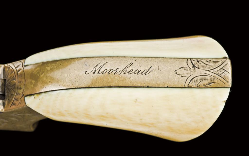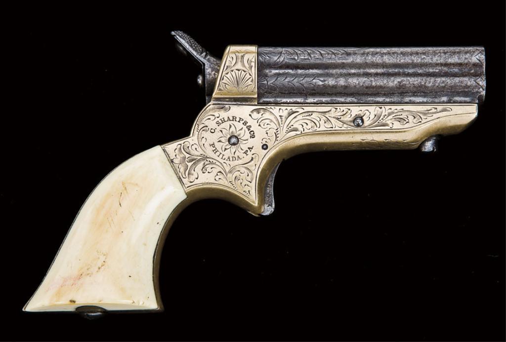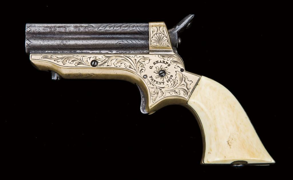 Sharps type I .22 cal rimfire pepperbox derringer, period scroll or factory engraved, original ivory grips, inscribed in script on backstrap "Moorhead". Purportedly 1 of a pair from the family of senator Moorehead who served during the civil war era #35953. The derringer remains in original good to very good condition with 40 - 60% blue drifting to patina on bbl's with some light erosion and pin-prick pitting just starting. The frame shows traces of silver plate and crisp "factory" style scroll engraving which matches on the bbl's. The original "fat" grips are very good plus w/a lovely patina. The markings are sharp, the action crisp and working. Tom Seymour Collection. Est. $1,500 - $3,000.