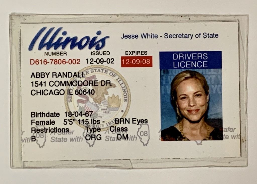 Original driver's license used by "Abby Randall", played by Maria Bello in the mystery thriller film "Shattered" (2007), where a perfect family's dynamic is ruined by a kidnapper's brutally efficient plot. Starring Pierce Brosnan, Gerard Butler, and Maria Bello.
