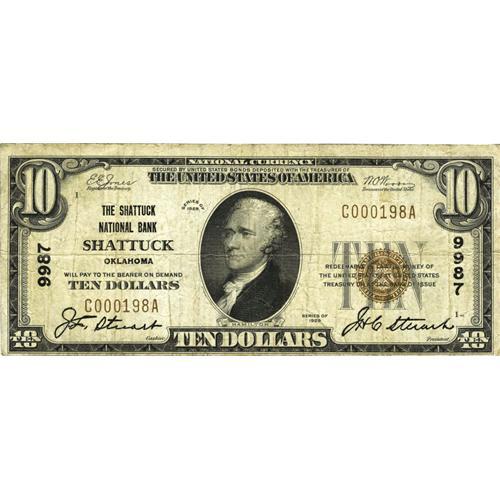 <B>Shattuck, OK</B></I> - $10 1929 Ty. 1 <B>The Shattuck NB</B></I> Ch. # 9987<BR>This was one of the smallest and most thinly capitalized banks in the state, and one which had a correspondingly low issue during its entire tenure. While three large and three small notes are known, offerings have been very sparse over the years, with only one large and one small example ever having been available at auction, with the sole appearance of the Series 1929 specimen coming back in a 1984 Hickman sale. <B>Fine,</B></I> likely to see considerable bidding to around the area of...