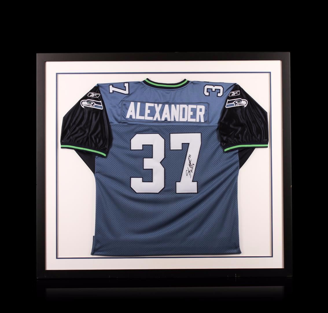 Shaun Alexander Framed Autographed Jersey. Comes with Certificate of Authenticity.