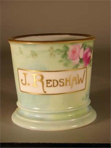 Shaving mug for J. Redshaw, floral design, marked Limoges-France. No chips or cracks.