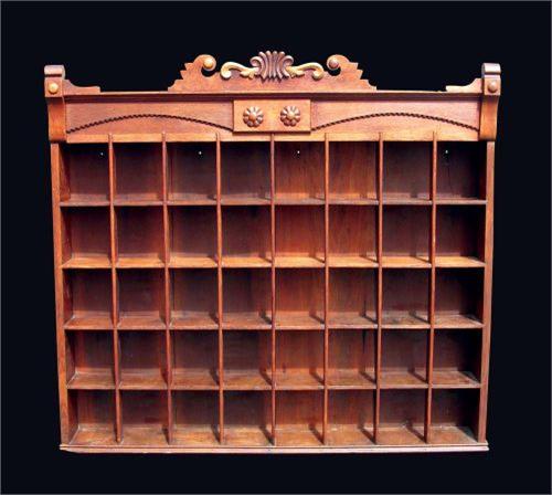 Shaving Mug Oak Rack, 40 compartments. Very good all original condition. 44 1/2 X 41 X 7 1/2 inches.