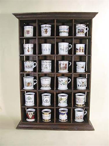 Shaving mug rack, 24 cubbyholes, approximately 28" x 36" oak, mugs not included.