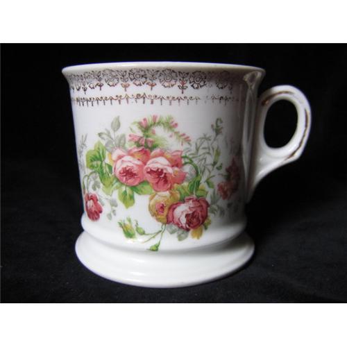 This beautiful shaving mug/cup is in near mint condition, showing only slight wear in the gold trim circling the rim near the handle and on the handle itself. It is numbered "67" on the bottom, near the backstamp which reads "O. & E.G. Royal Austria." It is adorned with roses. A lovely item.