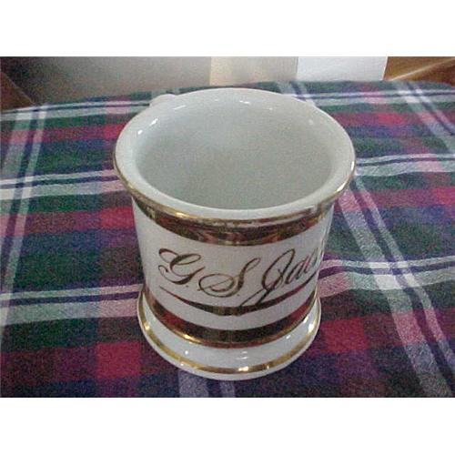 Shaving Mug, signed J.C. Bauarls on bottom; 3.5" diameter; white base china with gold ring and signed on face; G.S. Jackson (c)1800's; condition good ; no chips etc.