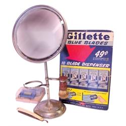 Shaving stand w/beveled mirror, bakelite brush, safety razor, Gillette Blades adv. display & Gillette razor, stand is 14"H.