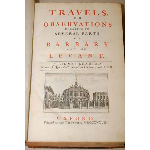 Shaw, Thomas. Travels or Observations Relating to Several Parts of Barbary and the Levant. Oxford: Printed at the Theatre, 1738. Folio - over 12" - 15" tall. Hard Cover. Ex-Library. Good Condition. With 32 engraved plates, plans and maps on 29 leaves (3 plates on recto and verso), plus a full page of sheet music, title vignette, chapter vignettes, text illustrations, head & tail pieces, and historiated intials. (Comprising 12 maps, plans & table - 5 of which are folding). Half-title, title in red & black, 2 leaves for Dedication, xv, 1 errata, 442pp [2] 60pp, 4 leaves for Index. Bound in leather with gilt border, raised bands on spine, red speckled page edges all around. Front cover detached, back cover starting, occasional foxing, covers worn, backstrip wear.