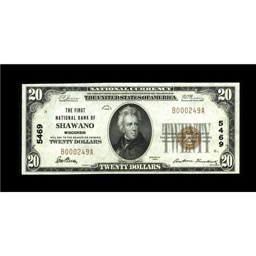 <B>Shawano, WI</B></I> - $20 1929 Ty. 1 <B>The First NB</B></I> Ch. # 5469<BR>While small notes from this bank can not be considered truly scarce, this is one of only two uncirculated examples from here that we know of. Bright <B>Choice Crisp Uncirculated.</B></I><BR><BR><b>Shipping:</b> Coin/Currency (<a target="_blank" href="http://www.heritageauctions.com/common/shipping.php">view shipping information</a>)
