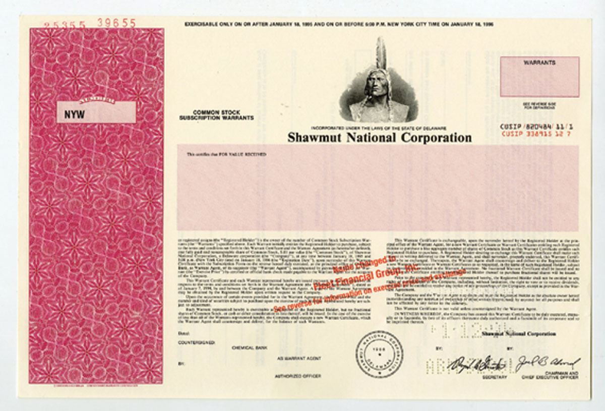 Transition stock Certificate with name change to Fleet Financial Group. Shawmut National Corporation is one of New England's largest banking companies, offering financial products and services in consumer banking, commercial markets, investment and trust services, and financial institutions. The company focuses on the consumer market, small- to medium-sized companies, and the insurance industry. Shawmut also offers financial services to correspondent banks, state and local governments, and select niches in national markets. The 1988 merger between the Connecticut-based, $14.1 billion Hartford National Corporation and the $10.4 billion, Massachusetts-based Shawmut Corporation positioned the present company as one of the 20 largest bank holding companies in the United States. Into the 1990s, Shawmut continued to pursue strategic growth in order to remain competitive in the dog-eat-dog dynamics of the banking industry. Shawmut National Corporation has been acquired and integrated into Fleet Financial Group Inc. The Company was a multibank holding company.