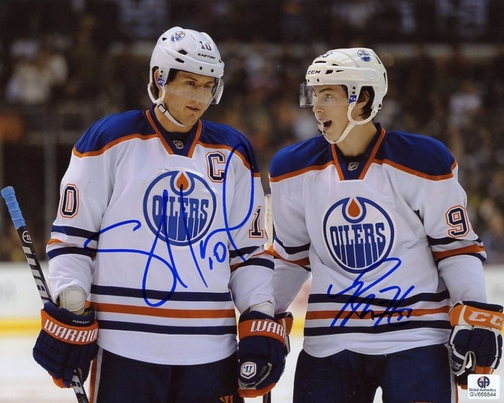 Photo has been hand-signed in blue felt-tip pen by Shawn Horcoff and Ryan Nugent-Hopkins. Autograph includes a Global Authentics (GA) hologram and matching COA for authenticity purposes.