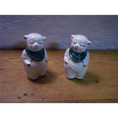 Wonderful Large size "Smiley" pig salt and pepper from Shawnee.These are 5 1/4" tall. One is perfect except for a small bit of discoloration right by the holes on top and the other also has the small discoloration but also has a 2" hairline on one side(see photo) Is still very sturdy but need to mention that.They have the dark green scarf around their neck.These are not newer reproduction ones.