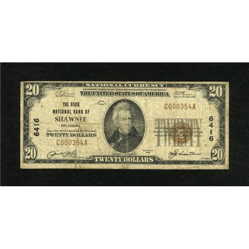 <B>Shawnee, OK</B></I> - $20 1929 Ty. 1 <B>The State NB</B></I> Ch. # 6416<BR>Twenty small are reported in the Track & Price census. <B>Very Good.</B></I><BR><BR><b>Shipping:</b> Coins & Currency (<a target="_blank" href="http://www.heritageauctions.com/common/shipping.php">view shipping information</a>)