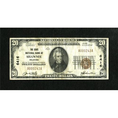 <B>Shawnee, OK</B></I> - $20 1929 Ty. 1 <B>The State NB</B></I> Ch. # 6416<BR> An attractive example from this issuer that failed in 1934. <B>Very Fine+</B></I>.<BR><I>From The Rolling Plains Collection</B></I><BR><BR><b>Shipping:</b> Coins & Currency (<a target="_blank" href="http://www.heritageauctions.com/common/shipping.php">view shipping information</a>)