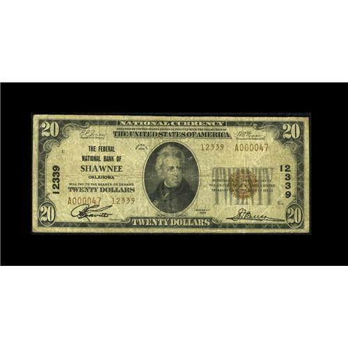 <B>Shawnee, OK</B></I> - $20 1929 Ty. 2 <B>The Federal NB</B></I> Ch. # 12339<BR>This is one of the "forbidden" titles that you seldom see. In fact only three banks with "Federal" in their title issued Series 1929 notes. Also very few Type Twos have been documented on this bank. <B>Very Good.</B></I>