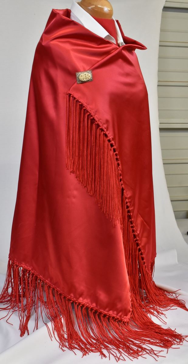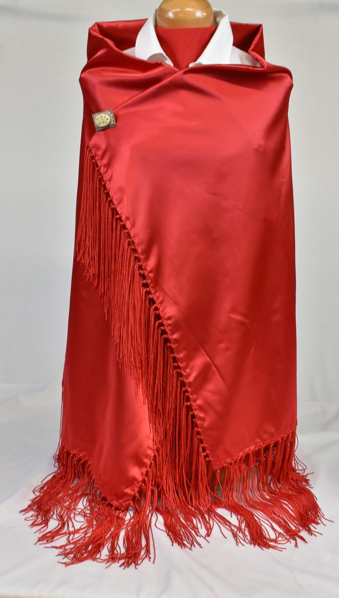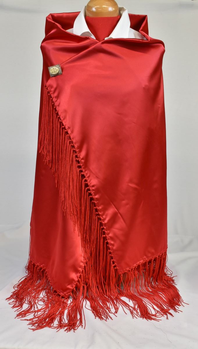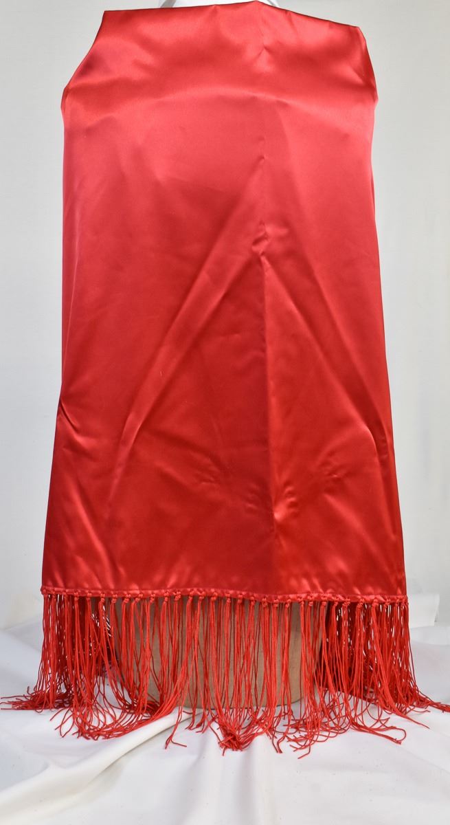 Native American Shawnee Potawatomi Red Satin Fringed Dance Shawl, measures 68'' x 68'', PIN NOT INCLUDED