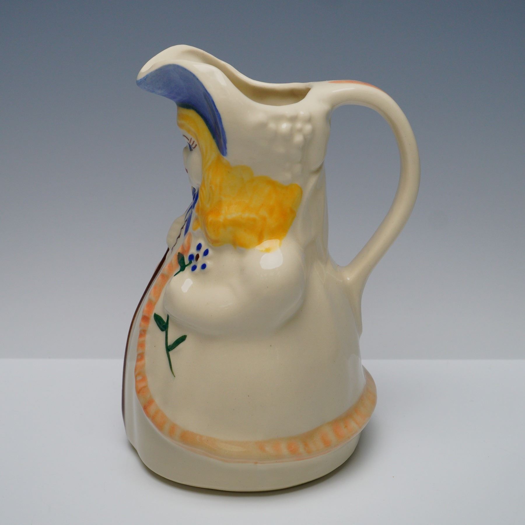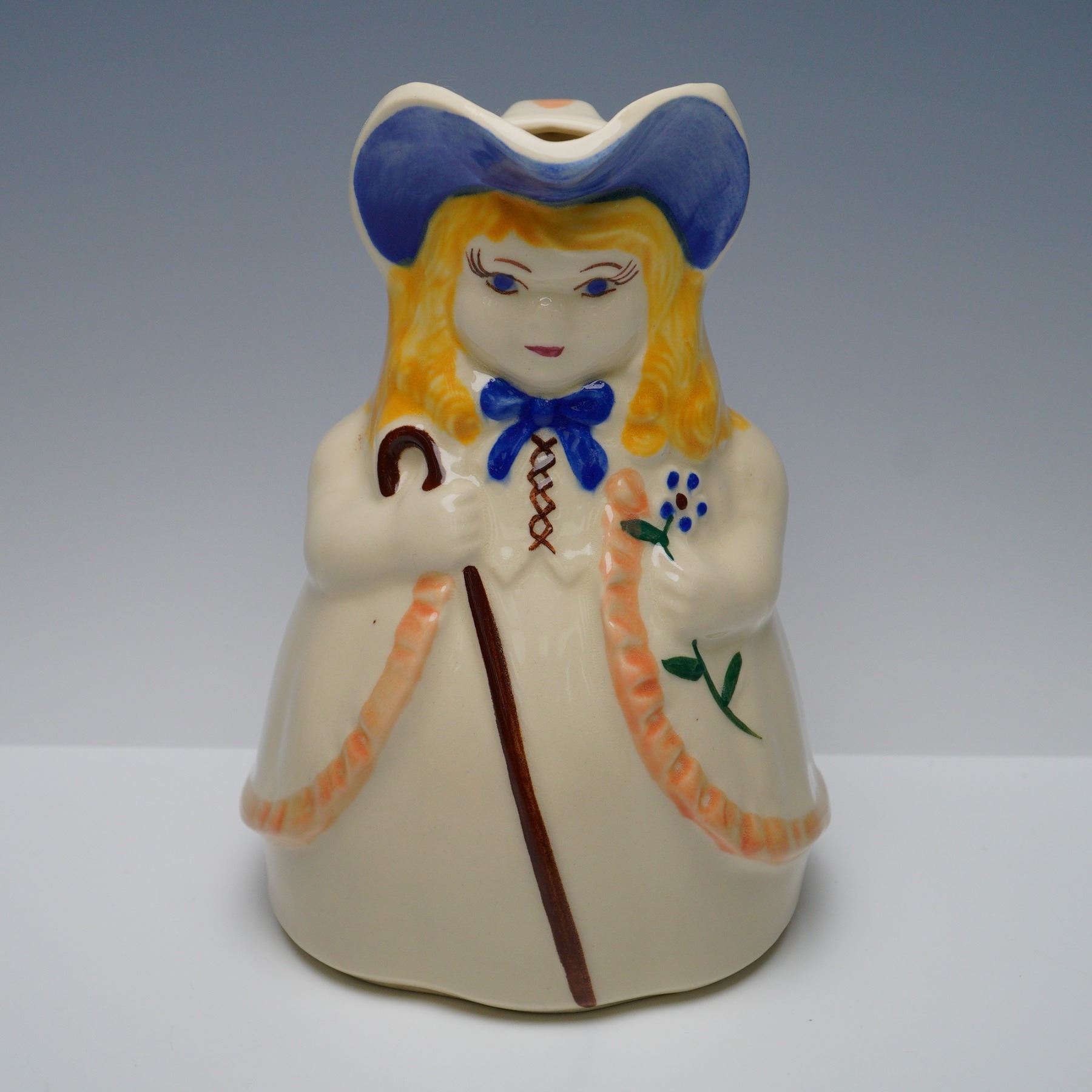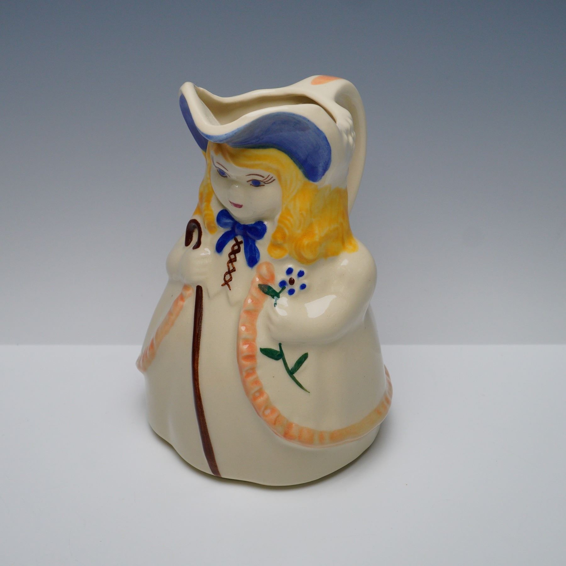 Charming figural milk pitcher by Shawnee Pottery, dating circa 1940s, depicting Little Bo Peep in a hand-painted ceramic design. Features include her wide blue hat, blonde curls, floral accents, and a curved handle integrated into her bonnet. The base is marked Patented Bo Peep U.S.A. A delightful and collectible piece of American kitchenware from the mid-20th century, prized for its whimsical form and vintage charm.
