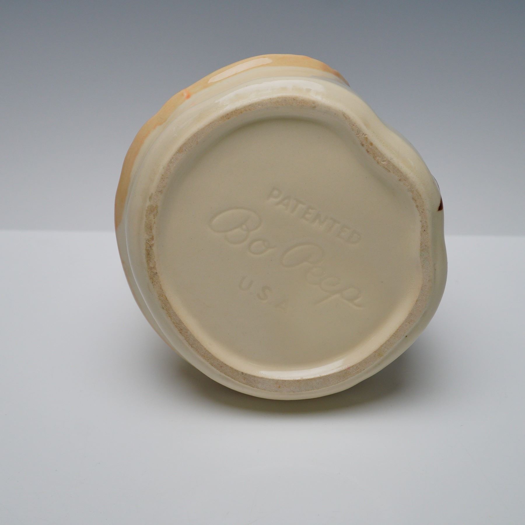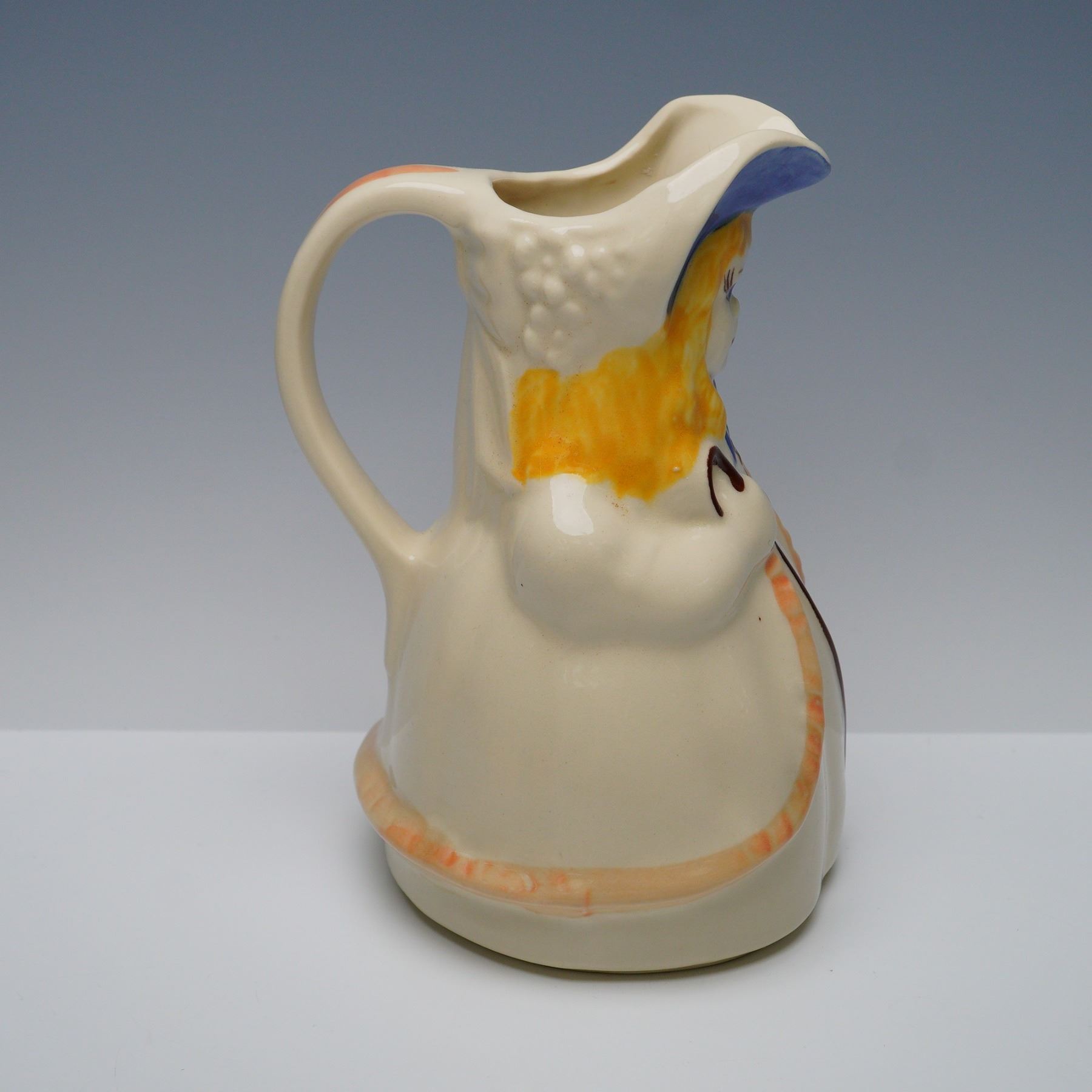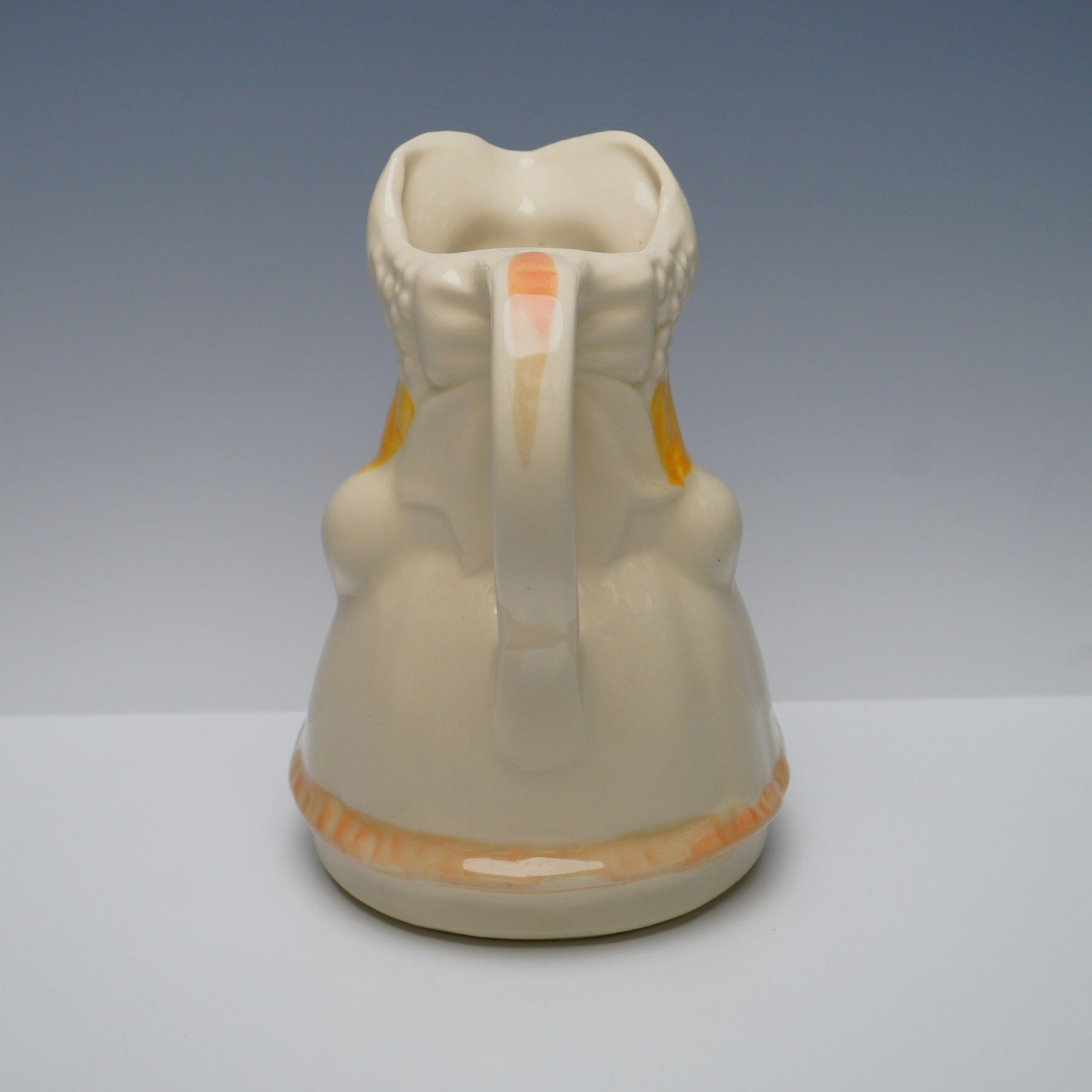 Charming figural milk pitcher by Shawnee Pottery, dating circa 1940s, depicting Little Bo Peep in a hand-painted ceramic design. Features include her wide blue hat, blonde curls, floral accents, and a curved handle integrated into her bonnet. The base is marked Patented Bo Peep U.S.A. A delightful and collectible piece of American kitchenware from the mid-20th century, prized for its whimsical form and vintage charm.