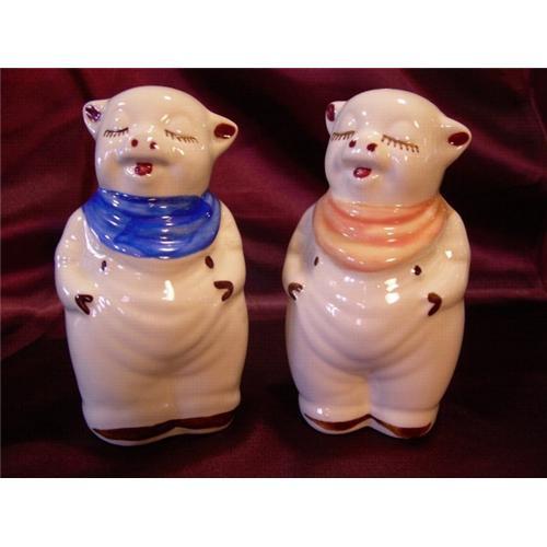 Up for sale is a matching set of Shawnee Smiley Pig Salt & Pepper. Condition is pretty good; the one with the peach scarf is close to mint--I'm not finding any defects on it at all. The blue scarfed smiley has a little bit of staining underneath the glaze (see photo) as well as a tiny little chip by its hole on the bottom. Otherwise, these two look great together. They both measure 5" tall. They would look great with your Smiley Cookie Jar! If you have any questions, please email us. Thanks for looking!