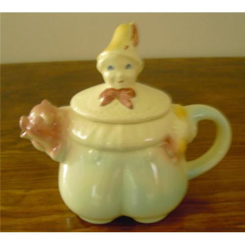 Wonderful teapot presentation of Mother Goose character 'Tom the Pipers Son' 'Stole a Pig and away he run'! The lid is Tom's head, hat and collar; the spout is the pig's head with mouth open. There is a small chip on the backside of the very top of the feather in his hat, otherwise in excellent condition-no cracks, crazing or stains. Colors are bright and crisp. Teapot is approx. 7"Hx8"Lx5"W; mark reads: Tom the Pipers Son Patented USA 44. PAYPAL Accepted. USD Only.
