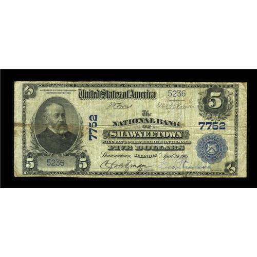 <B>Shawneetown, IL</B></I> - $5 1902 Plain Back Fr. 598 <B>The NB of Shawneetown</B></I> Ch. # 7752<BR>This is one of only 8 large in the census for this Gallatin County bank. Of those eight notes, only a couple have a higher grade than this example. This bank went into receivership on May 26, 1930 leaving a large size outstanding of only $1350. The penned signatures are in black ink for the cashier and blue for the president. Shawneetown served as an important United States government administrative center for the Northwest Territory after the American Revolution. The only towns chartered by the United States government are Shawneetown and Washington, D.C. <B>Fine.</B></I><BR><I>From The Lincoln Collection</B></I><BR><BR><b>Shipping:</b> Coins & Currency (<a target="_blank" href="http://www.heritageauctions.com/common/shipping.php">view shipping information</a>)