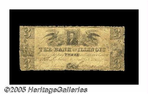 <B>Shawneetown, IL- The Bank of Illinois</B></I> $3 G48<BR>A very scarce albeit very well-circulated three. <B>Very Good,</B></I> with plenty of wear and numerous tiny splits.