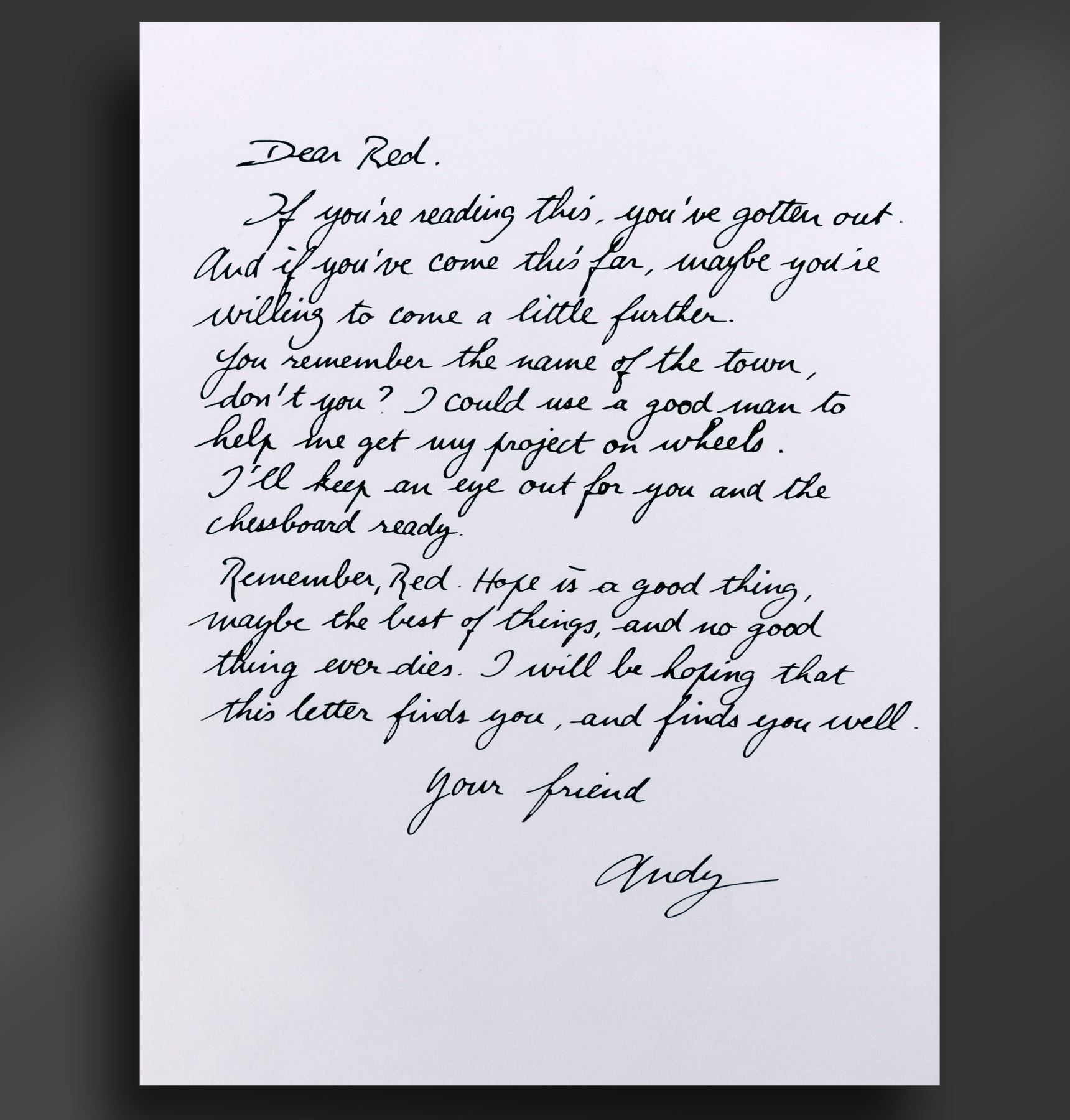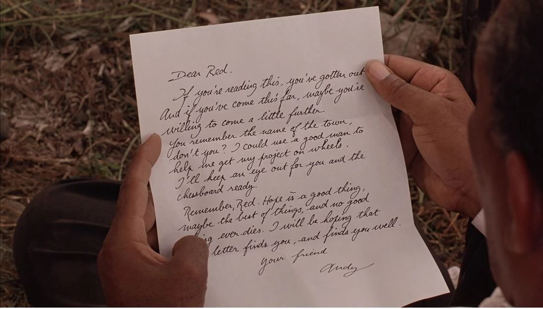 Letter penned by Andy Dufresne (Tim Robbins) to Ellis "Red" Redding (Morgan Freeman) in Frank Darabont's prison drama, The Shawshank Redemption. Andy Dufresne (Tim Robbins) is sentenced to two consecutive life terms in prison for the murders of his wife and her lover and is sentenced to a tough prison. However, only Andy knows he didn't commit the crimes. While there, he forms a friendship with Red (Morgan Freeman), experiences brutality of prison life, adapts, helps the warden, etc., all in 19 years.