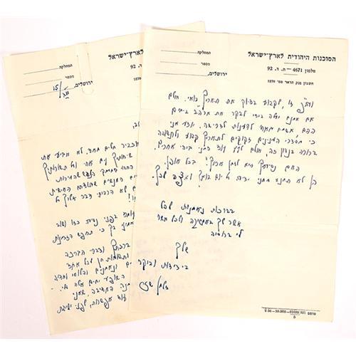 <Our item number 140726><B>Zalman, Shazar.</B> (1889-1974) Author, poet and the third president of Israel (1963 - 1973); his portrait is printed on the 200 NIS bills. Autograph letter signed, on Jewish Agency for the Land of Israel (Shazar was acting chairman 1956-60), 2pp, in Hebrew, Jerusalem, n.y. 15 Dec. To an American friend, expressing gratitude for gifts from Shazar's brother, for greetings from the Hebrew Language and Culture Association, and regarding a possible visit to the United States. With English translation. Also with a 1972 card, written and signed in English. <BR>Estimated Value $400 - 600. <BR><BR>Our item number 140726<BR><IMAGES><P ALIGN="CENTER"><IMG SRC="http://www.goldbergcoins.net/liveauction/49jpegs/140726.jpg"> </P></IMAGES>