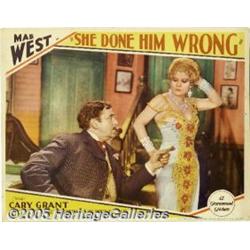 <B>She Done Him Wrong (Paramount, 1933)</B></I> Lobby Card (11" X 14"). Mae West's best film, the only one to be released before the Hays Office essentially shut down her bawdy personality. Also the film that made Cary Grant a star, as Mae looked with lust in her eyes at the "tall, dark and handsome" leading man. This scene card has Mae's most famous pose, one hand on her hip and the other behind her head as she talks to Noah Beery. Pinholes, corner wear, corner creases and slight border soiling. Still a very nice card with vibrant colors. Fine/Very Fine.