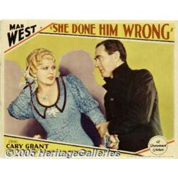 <B>She Done Him Wrong (Paramount, 1933)</B></I> Lobby Card (11" X 14"). Mae West holds a variation of her famous pose even as she backs away from the gun that ex-boyfriend Owen Moore is holding on her. Mae's Lady Lou is the epitome of the bawdy character that she became famous for. This film, full of Mae's well-known lines, was one of the main reasons that the Production Code started to be heavily enforced in 1933. This bright clean card has a wonderful shot of Mae. Pinholes, slight edge and corner wear, light soiling and a small wrinkle in the picture area. Very Fine+.